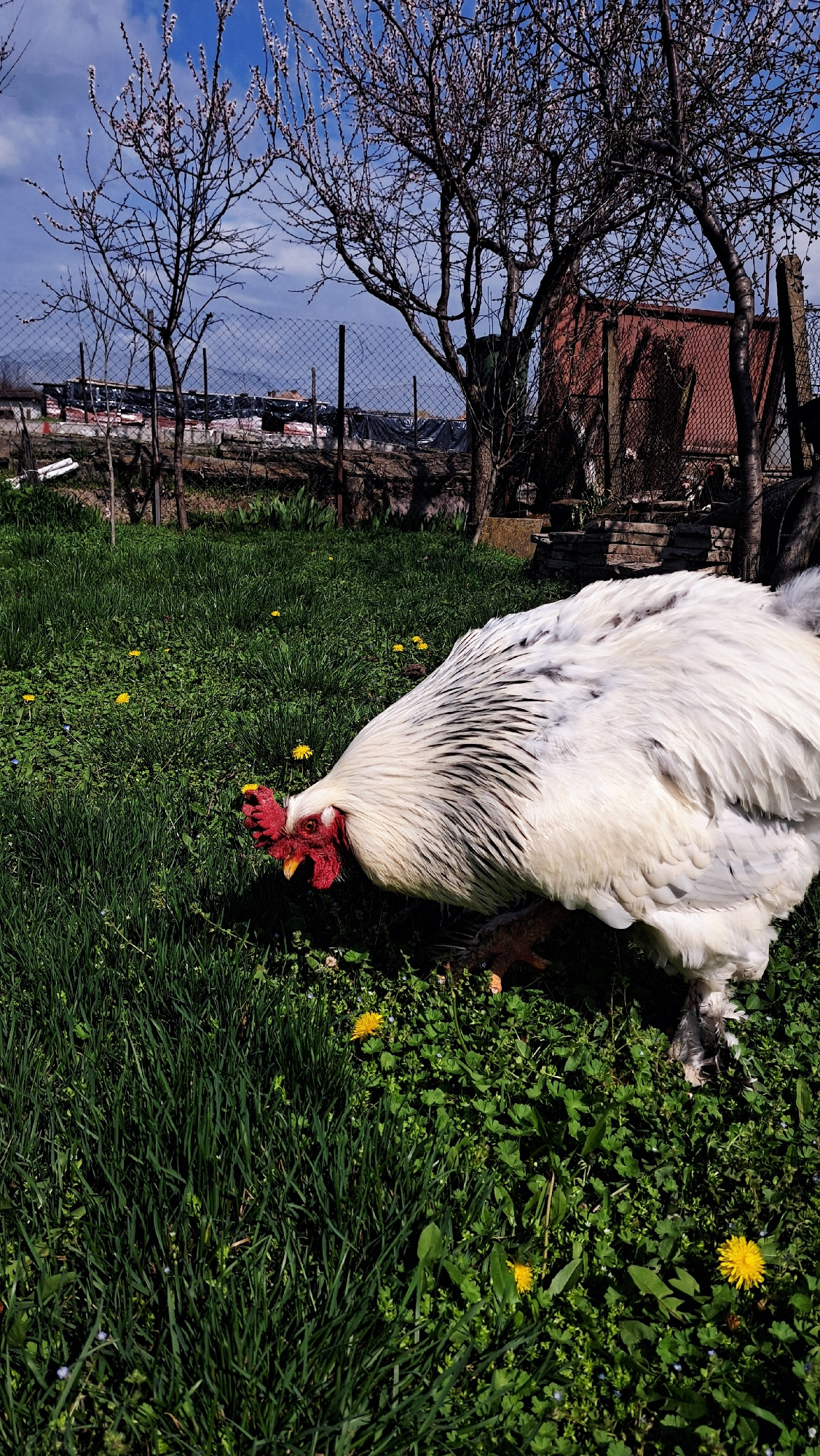 The image shows a large white rooster standing in a grassy yard, possibly in Glavinitsa, Bulgaria, given the prompt’s request. The rooster has black and white feathers and a prominent red comb. It is…read more