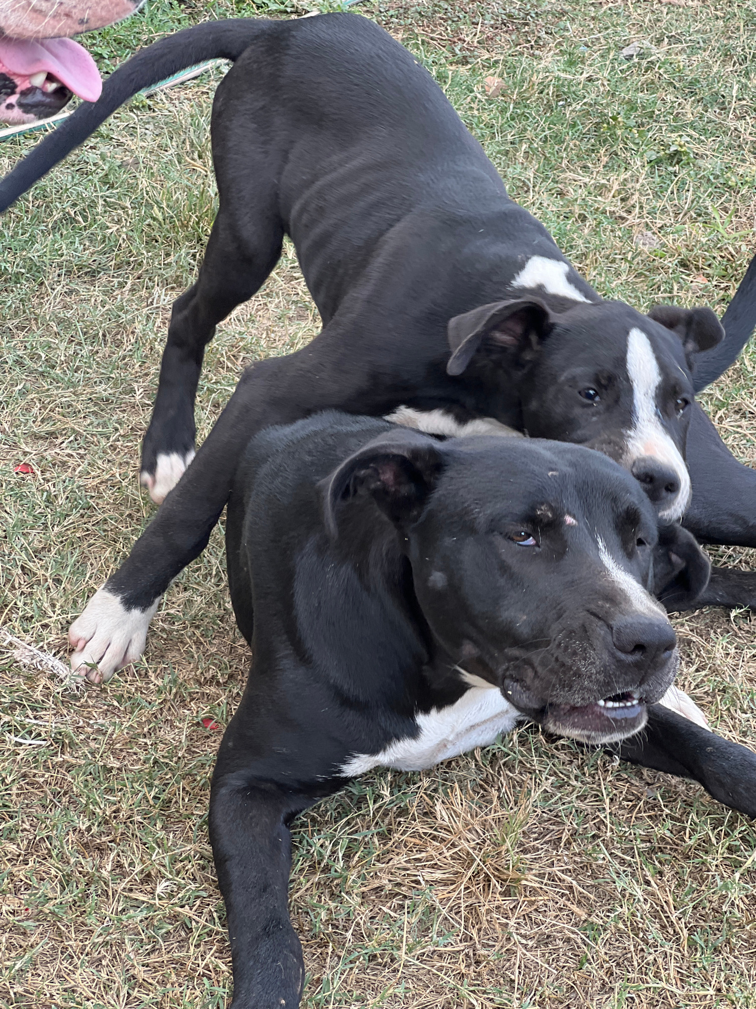 Two black and white dogs are lying on dry grass, possibly playing or wrestling. The location is likely Sumalao, Argentina.