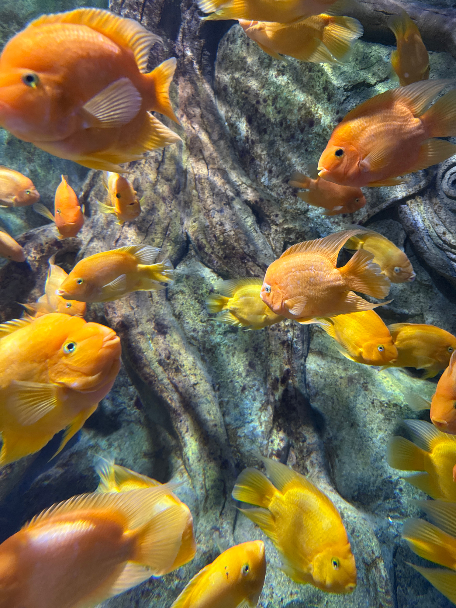 A densely populated freshwater aquarium tank is depicted, likely situated within the VinWonders Nha Trang aquarium in Nha Trang, Vietnam. The scene features numerous bright orange and yellow-orange fi…read more