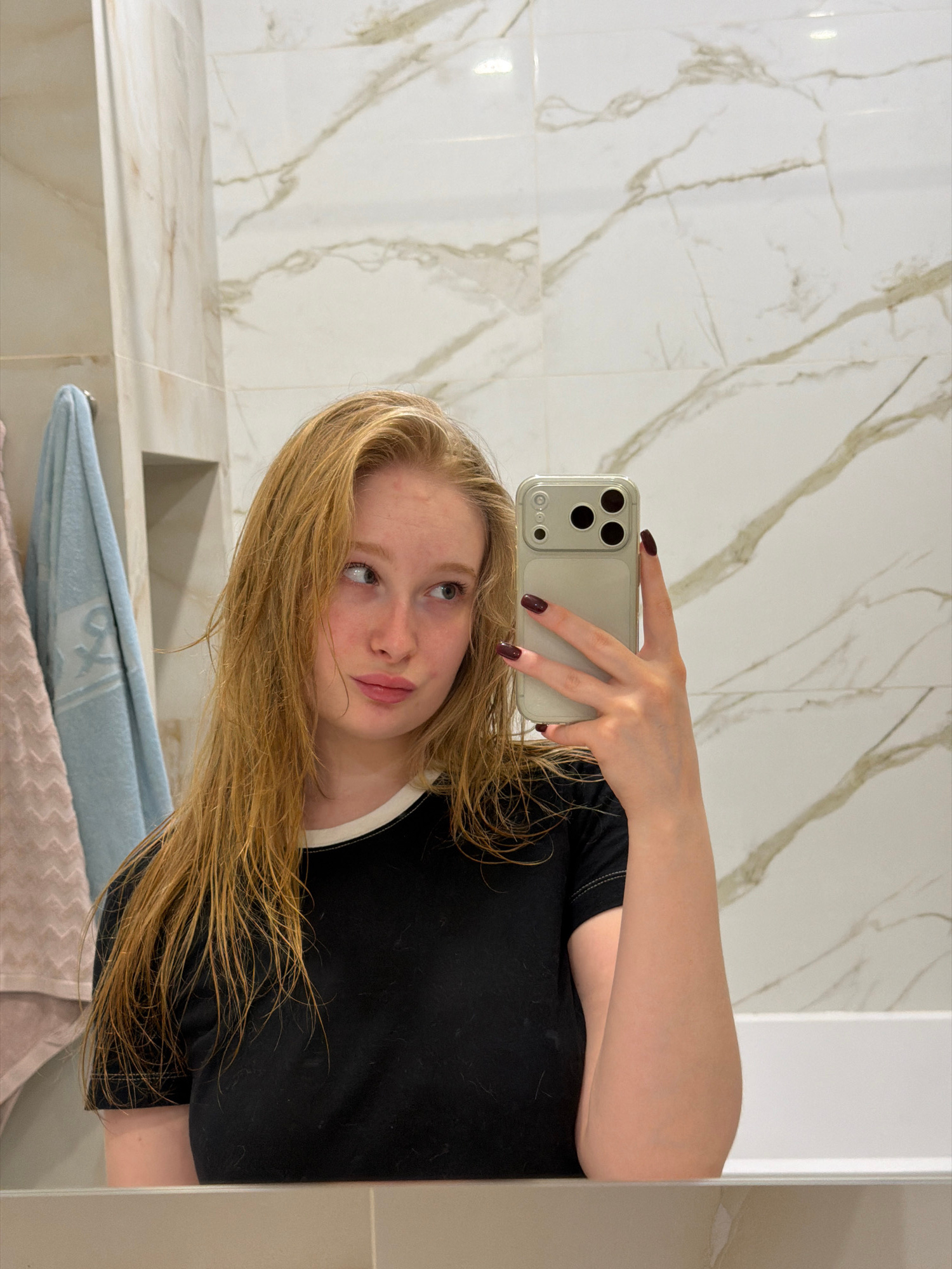A person is taking a selfie in a bathroom. The person is a young woman with long, blonde hair, wearing a black shirt with white trim. She is holding a smartphone with a beige case, visible against the…read more