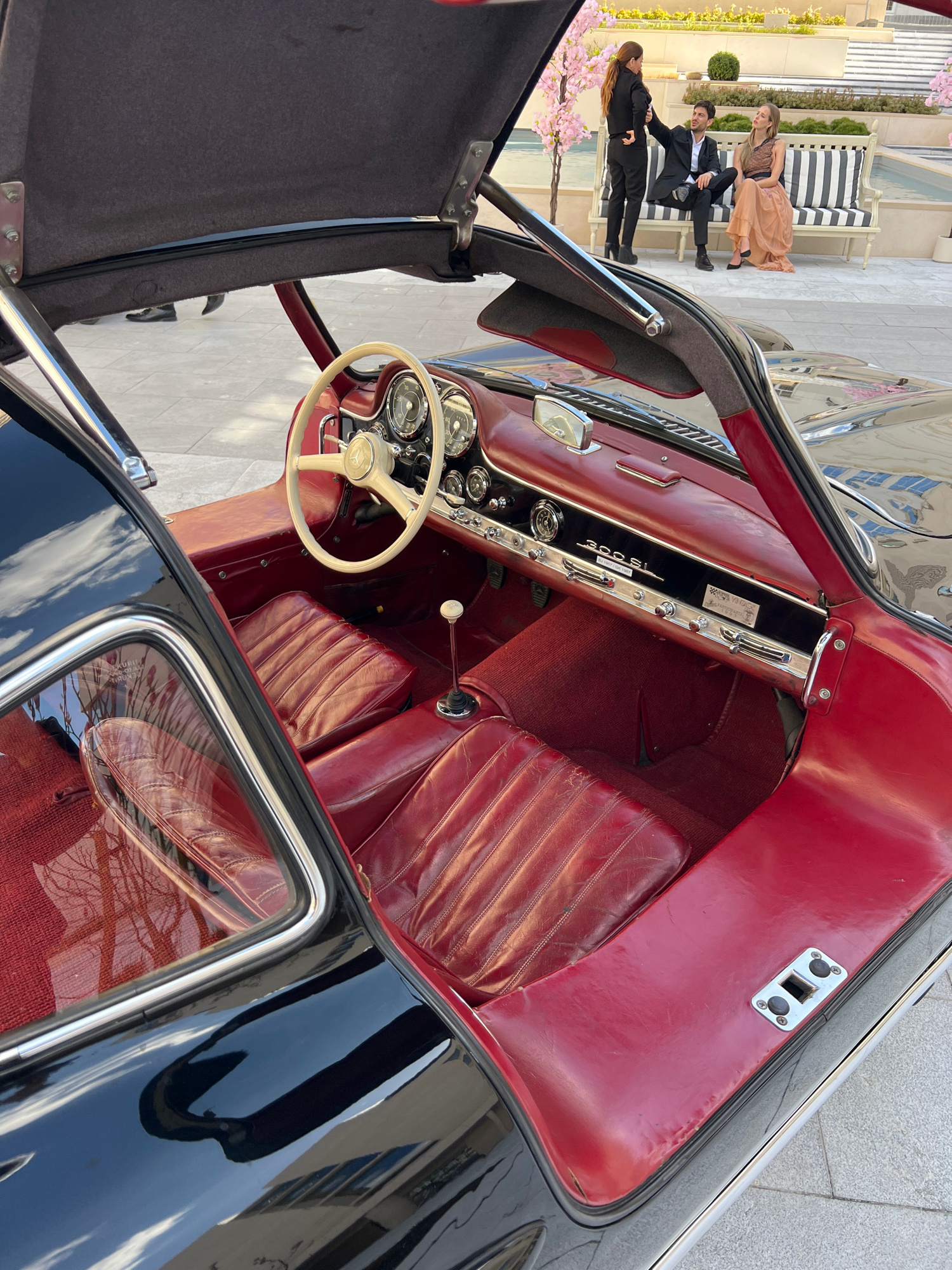 The image shows the interior of a black Mercedes-Benz 300 SL Gullwing. The interior is red leather, including the seats, door panels, and carpet. The dashboard is black with chrome accents. The steeriβ¦read more