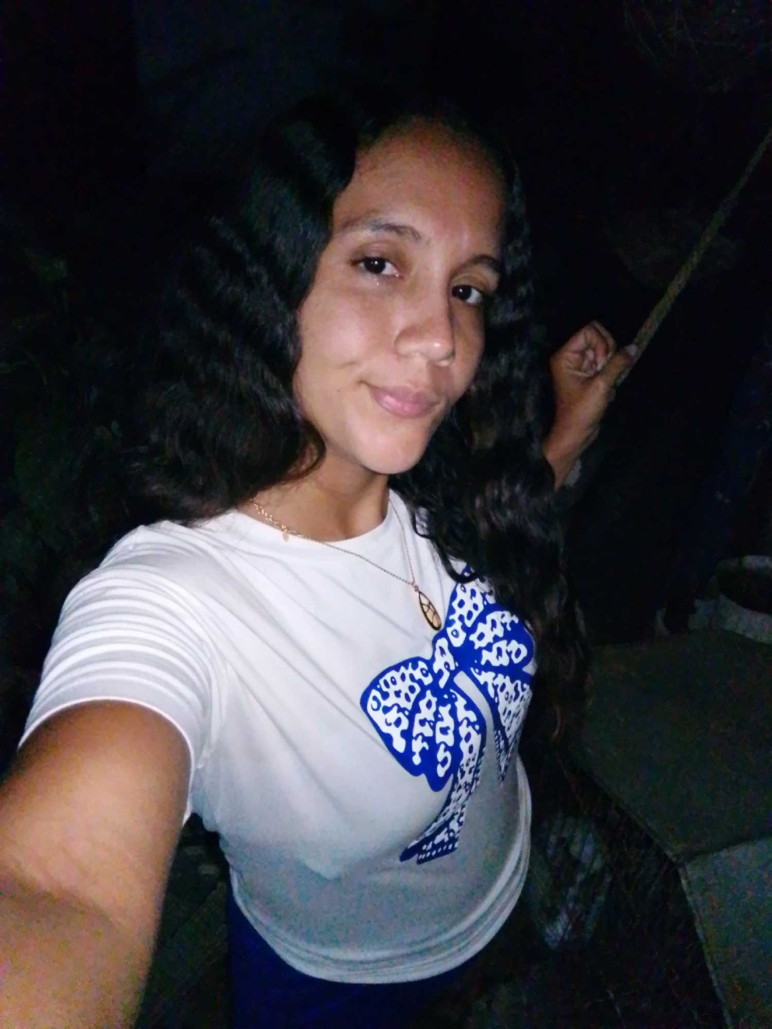 A woman with long, dark curly hair stands against a dark, indistinct background. She wears a white t-shirt with a blue and white patterned design and a thin gold necklace. She is holding a thin, light…read more
