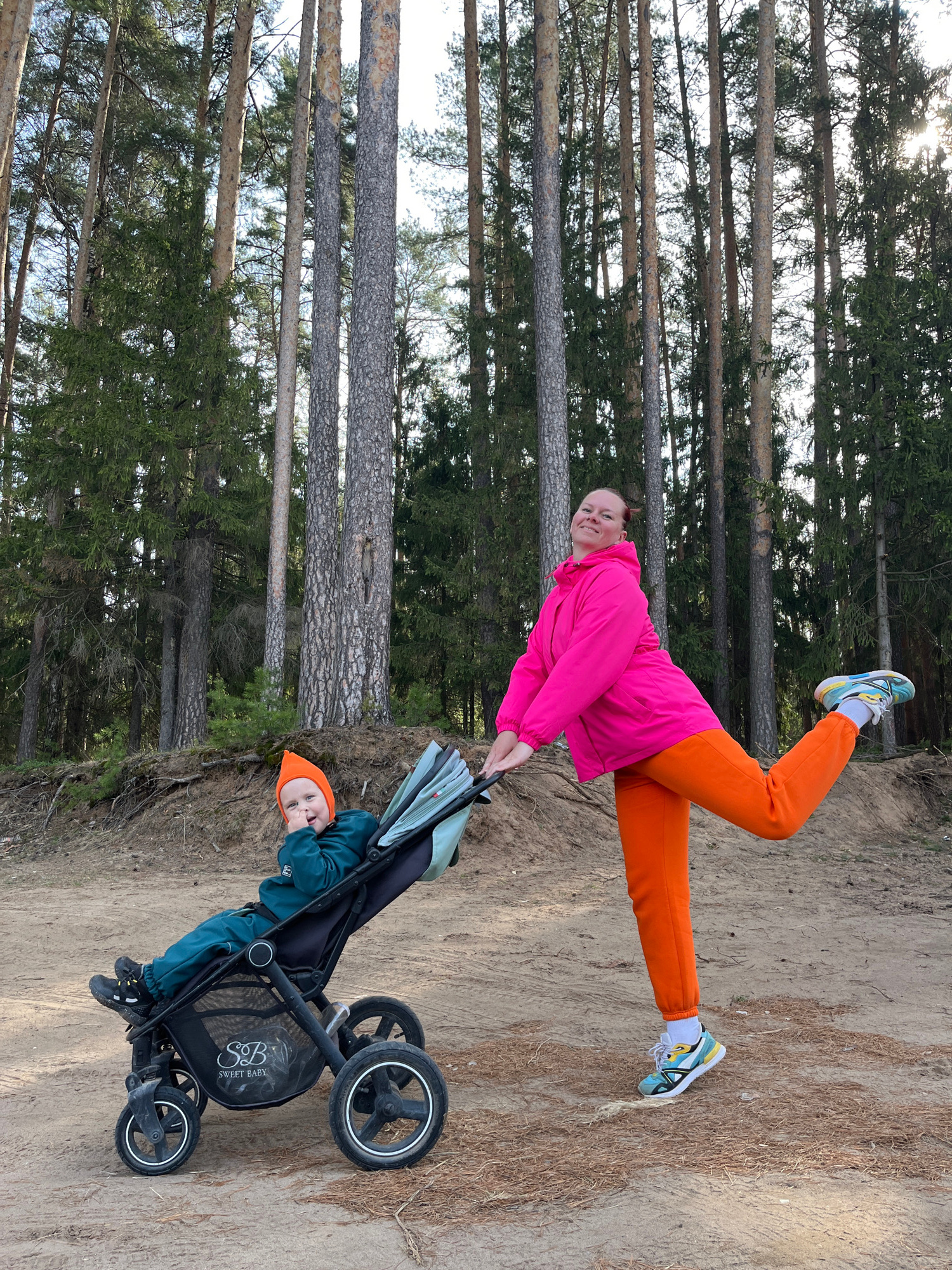 A woman and child in a stroller are positioned in front of a wooded area. The woman, wearing a bright pink jacket and orange pants, is standing on a sandy path. She holds the stroller, in which a chil…read more