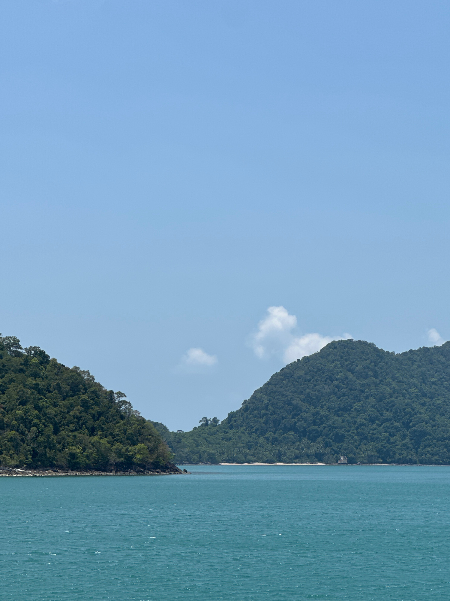 A daytime shot shows a blue sky with a few small clouds, a forested coastline with lush green vegetation, and clear turquoise water in the foreground. The location appears to be Baan Klong Son, Thaila…read more