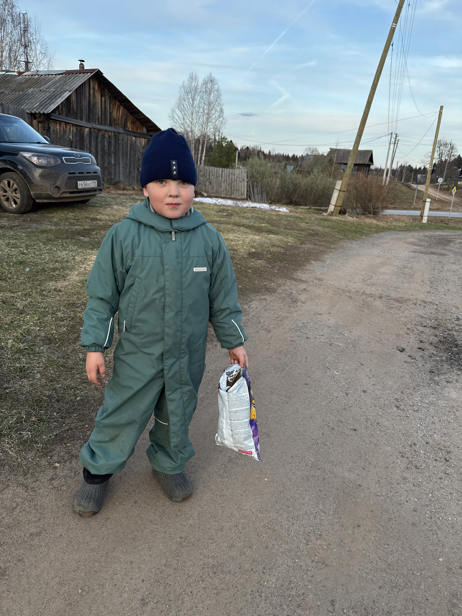 A young child dressed in a green jumpsuit and a dark blue beanie stands on a dirt road. He is holding a partially open bag of snack food in his right hand. Behind the child to the left is a dark-color…read more