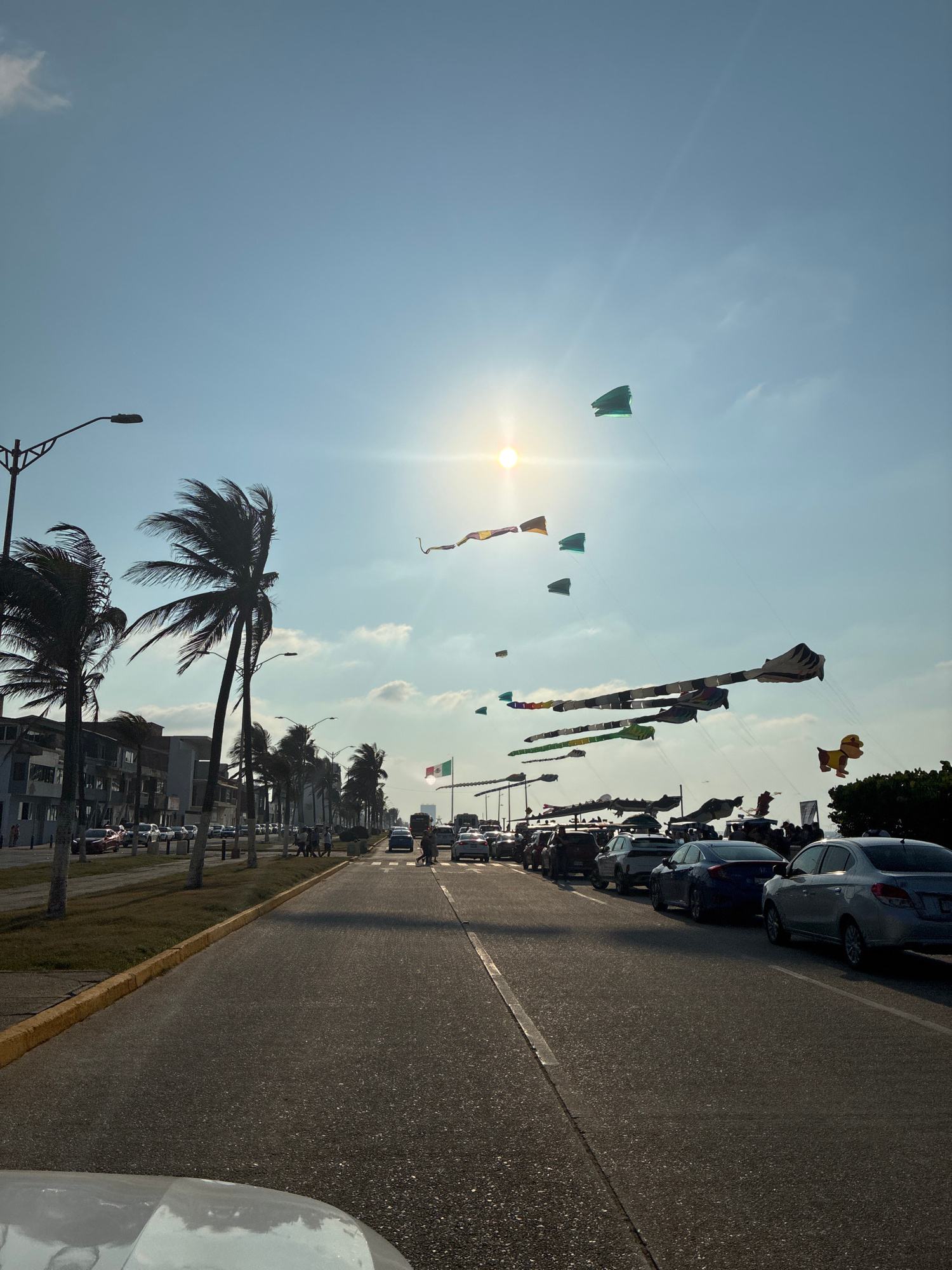 The image displays a daytime scene on a coastal boulevard in Coatzacoalcos, Mexico. A bright sun is visible in the upper-left sky, which is clear blue with scattered white clouds. Numerous kites of va…read more