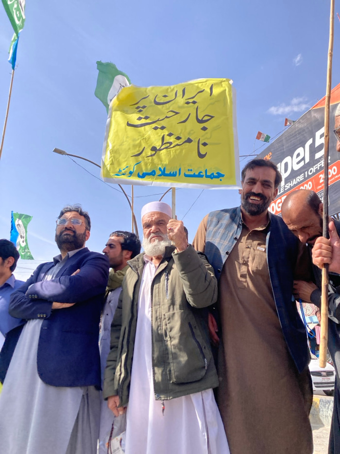 The image displays a daytime outdoor gathering of at least five men in Quetta City Tehsil, Pakistan, characteristic of a protest or political rally. In the central foreground, an older man with a prom…read more
