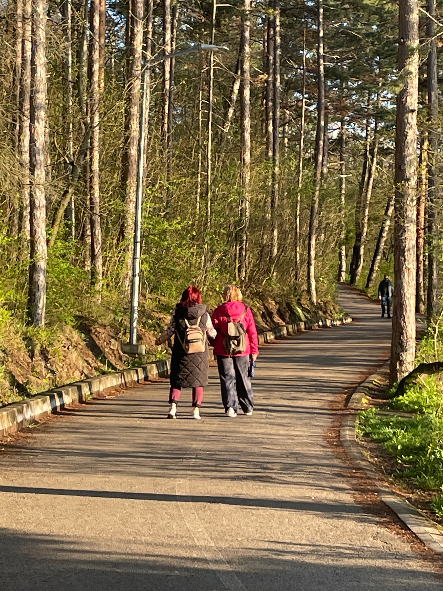 The image depicts a paved path winding through a wooded area. Two women are walking along the path, one wearing a red jacket and the other a quilted brown coat. Further ahead, a lone figure walks in t…read more