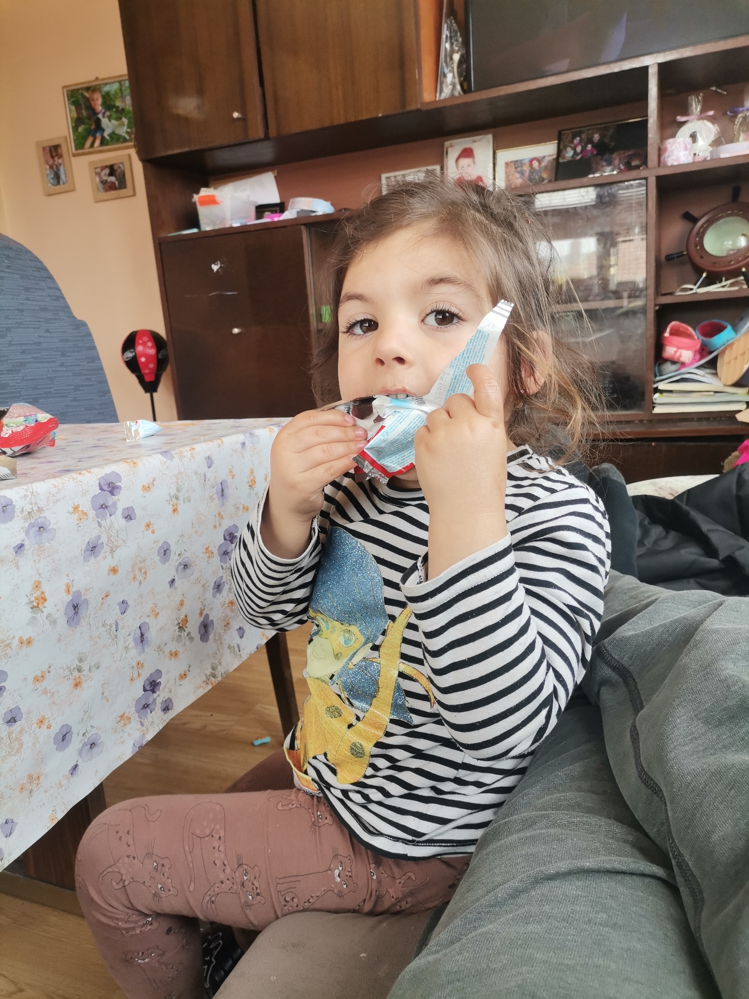 A young child with brown hair and eyes is sitting at a table covered with a floral tablecloth. The child is wearing a striped long-sleeved shirt with a graphic on the front and brown leggings. She is…read more