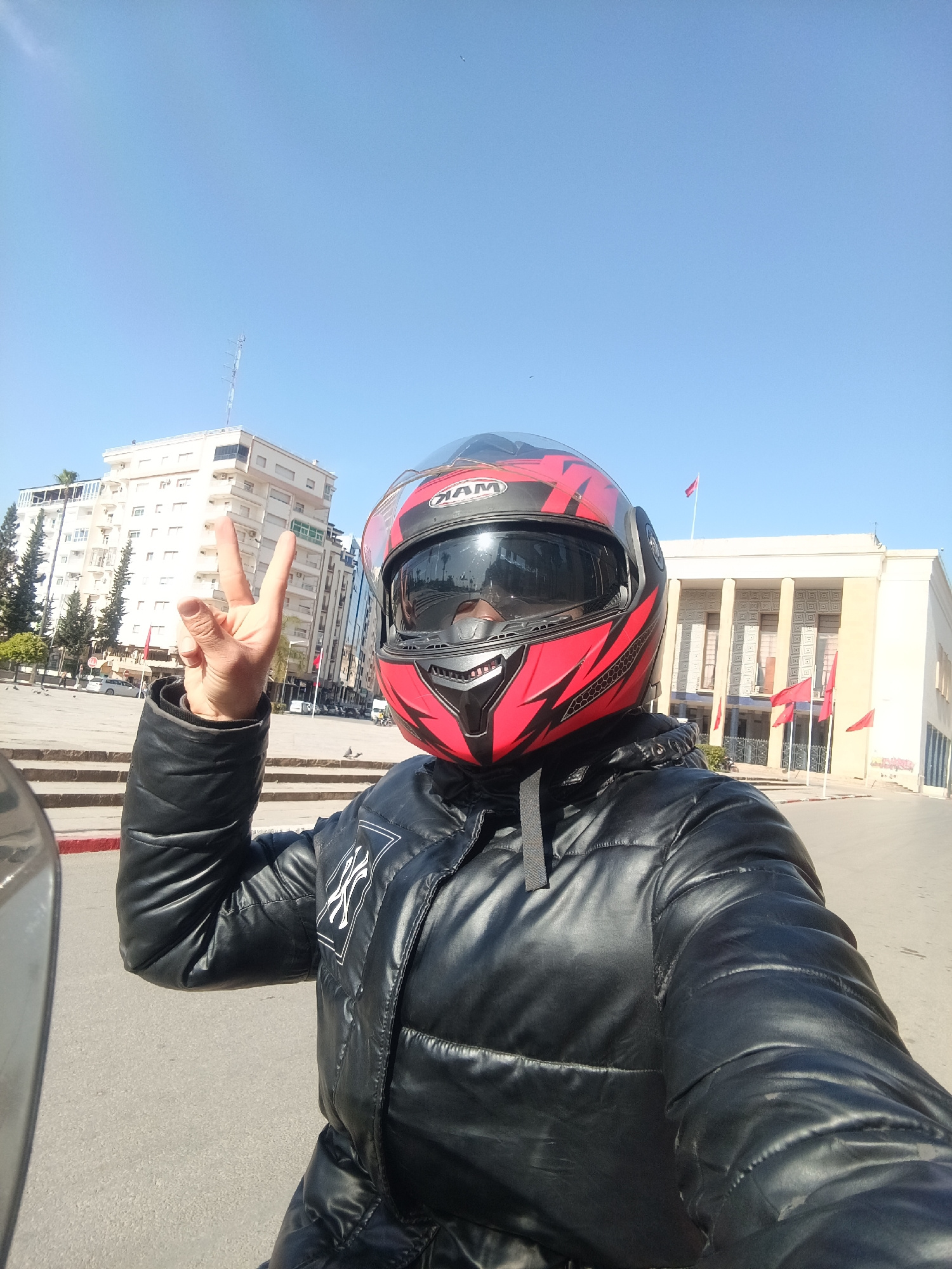 A person wearing a red and black motorcycle helmet and a black puffy jacket is taking a selfie, holding up a peace sign. The location is Meknes, Morocco, as indicated by the red Moroccan flags in the…read more
