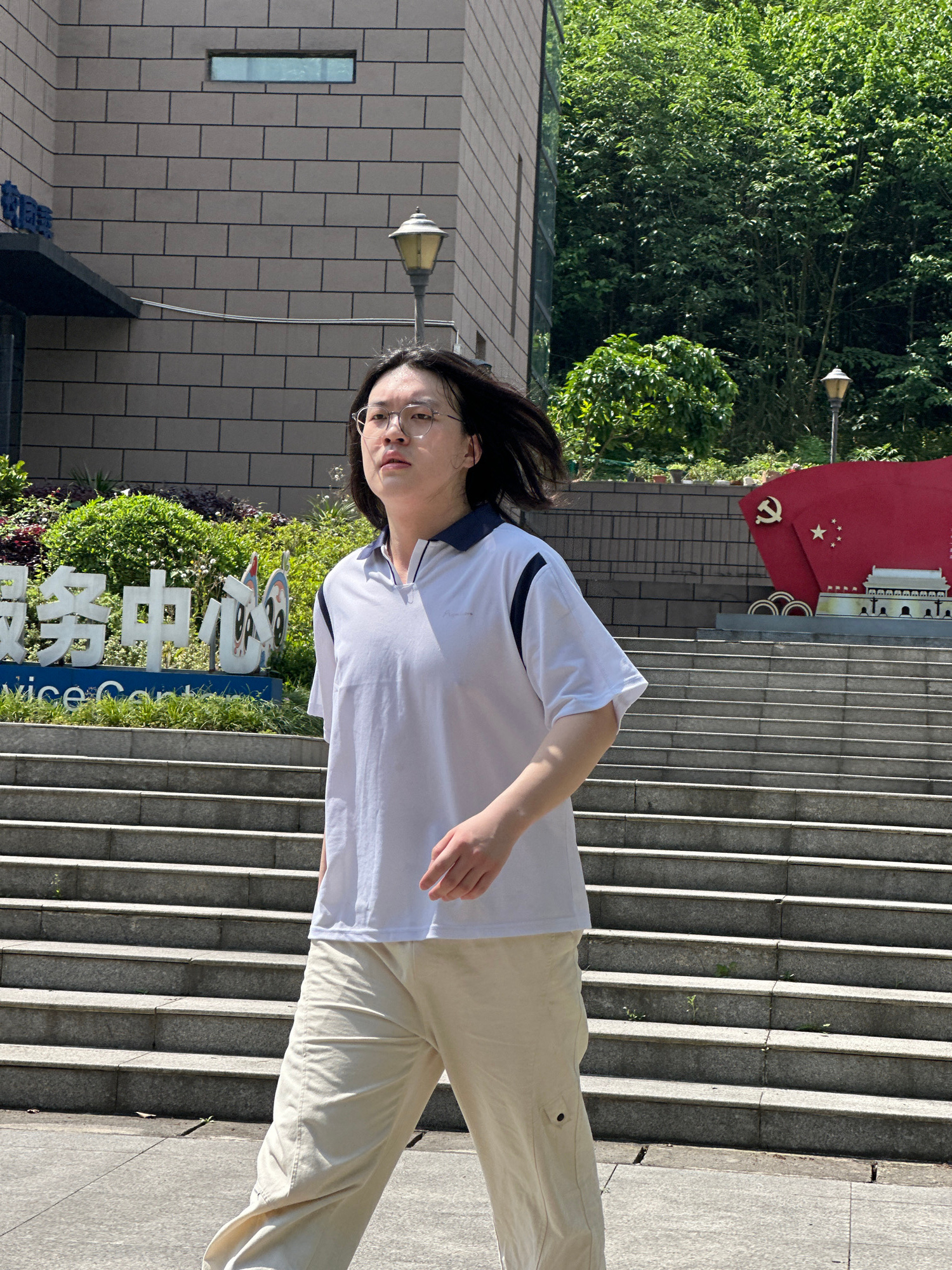 An outdoor, sunlit, full-body portrait captures an adult with long dark hair and glasses, wearing a white short-sleeved polo shirt with a dark blue collar and trim, and light beige pants. They stand w…read more