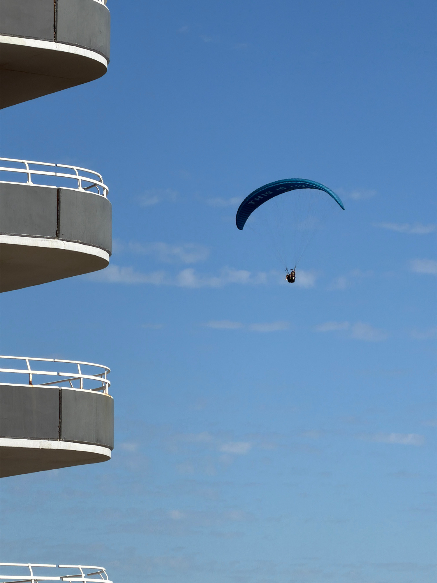 The image shows a kite surfer in the sky above what appear to be the arch-shaped tops of building structures. The kitesurfer is suspended beneath a blue kite with the text "THIS IS..." printed on its…read more