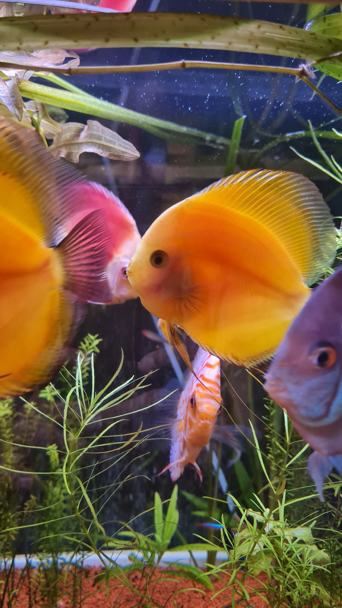 A vibrant close-up depicts an active freshwater aquarium environment, primarily featuring several Discus fish (Symphysodon species) and lush aquatic plants. In the immediate foreground, a striking ora…read more