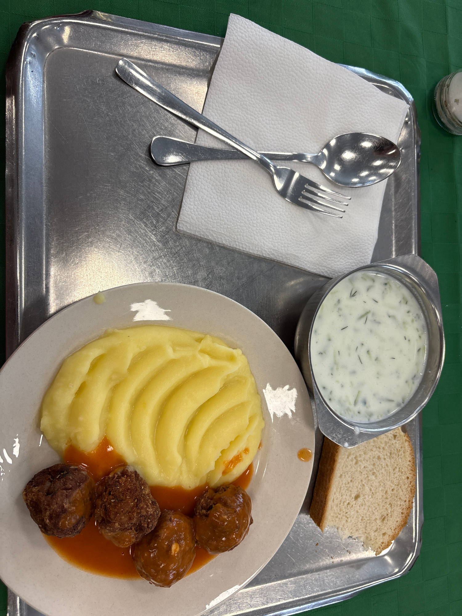 A meal on a metal tray sits on a green surface. The meal includes a white plate with mashed potatoes and four meatballs in a sauce. A metal bowl containing a white soup with green flecks rests beside…read more