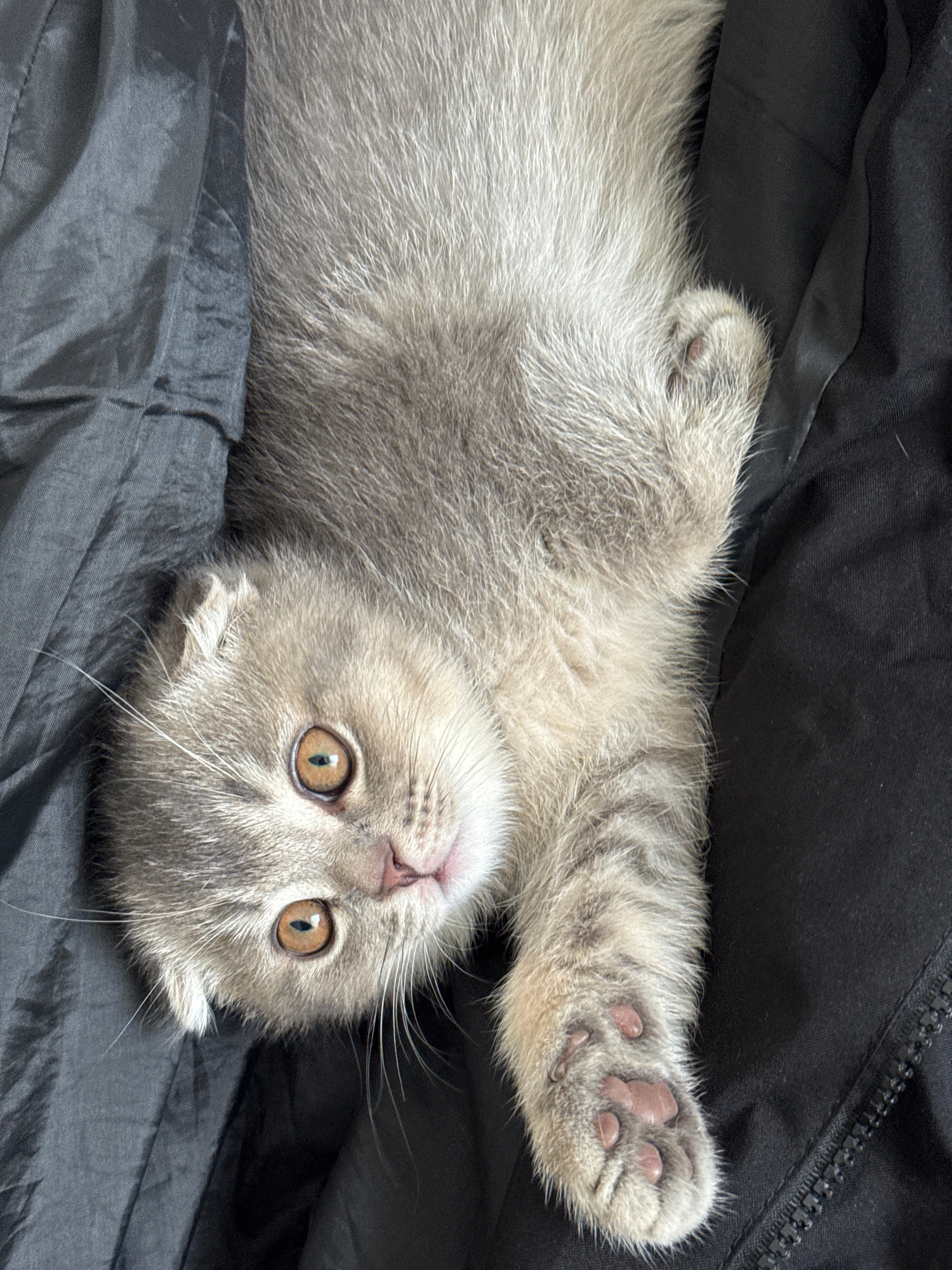 A light gray kitten with amber eyes lies on its back on a black, possibly nylon, fabric surface. The kitten's right paw is raised and displays pink paw pads. The kitten is facing upwards, looking dire…read more