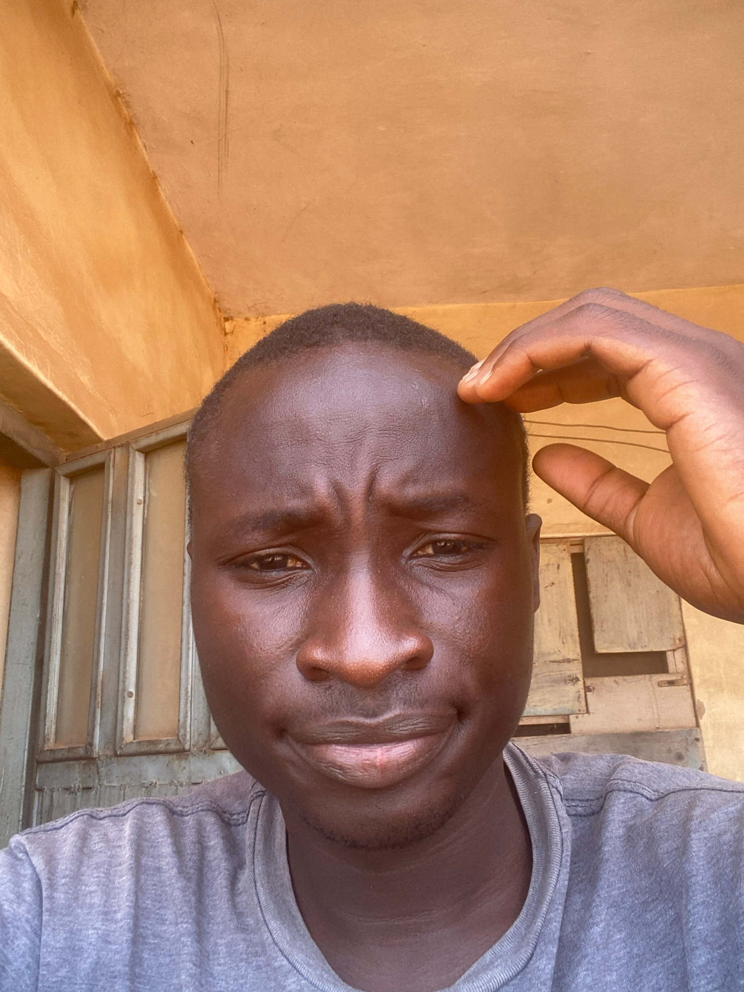 A dark-skinned man is indoors, likely sitting. His right hand is touching his forehead. The background shows a light brown wall and a metal window or door with horizontal panes. The man is wearing a g…read more