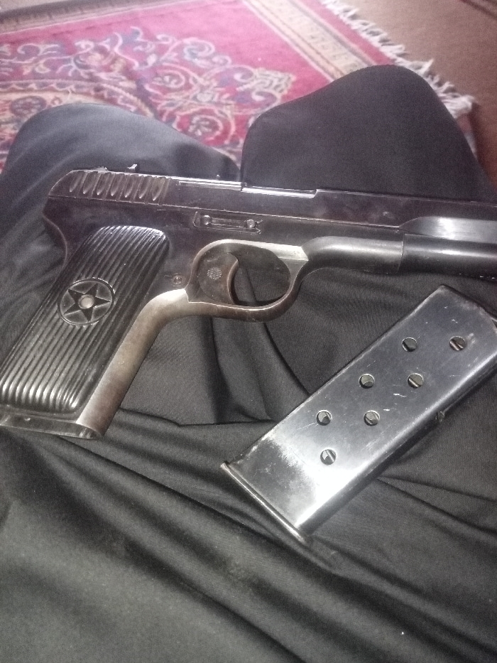 The image displays a dark-finished semi-automatic pistol, consistent with a Tokarev TT-33 type, and its detached steel magazine resting on an individual's lap. The pistol features ribbed grip panels,…read more