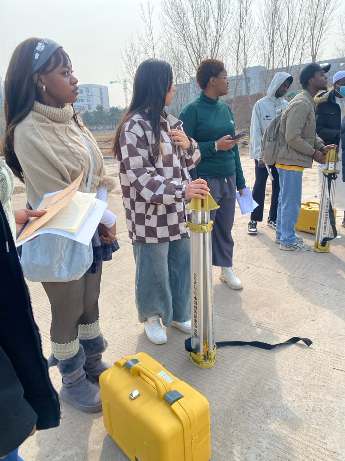 The image captures an outdoor scene in the city of Zhongtun, China, featuring a group of seven individuals standing on a concrete surface under a clear sky. From left to right: a partially visible per…read more