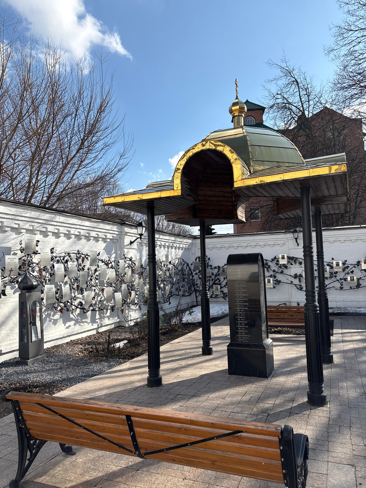 The image presents a scene in what appears to be a public space in Ulyanovsk, Russia, featuring architectural elements and memorials. The most prominent structure is a small, ornate building with a go…read more