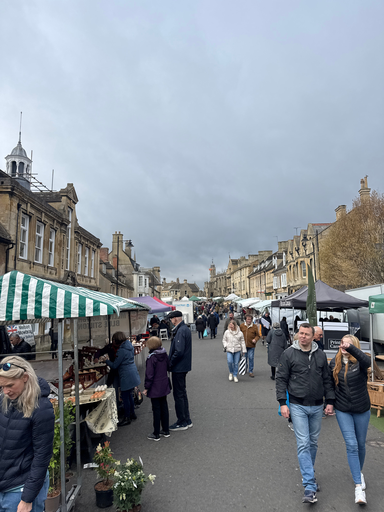 The image shows a street market in South Kesteven, United Kingdom. People are browsing stalls under a cloudy sky. The market stalls sell various goods, including flowers and antiques. Buildings line t…read more