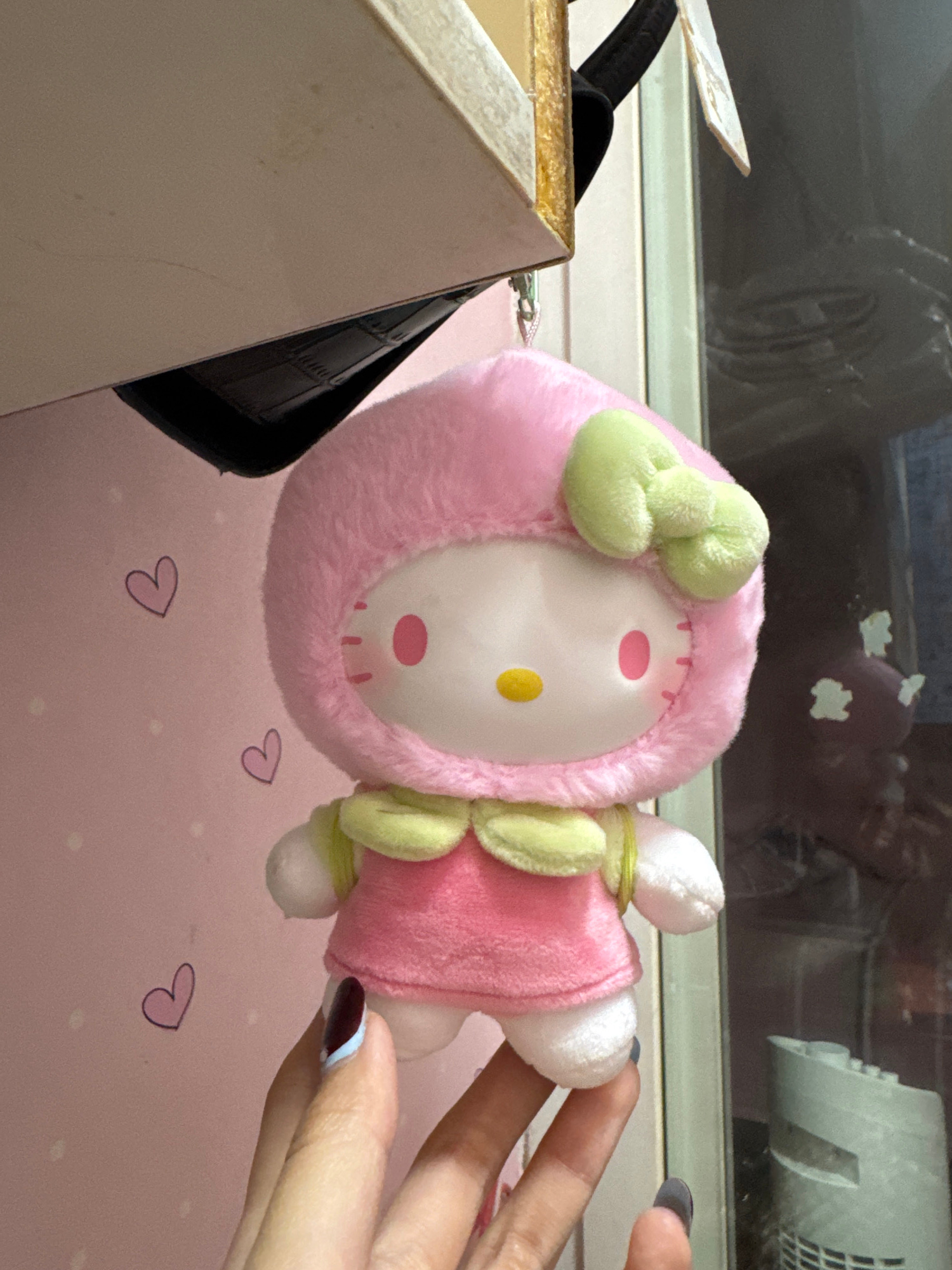 A plush toy resembling the Sanrio character My Melody is the central subject, held upright by a human hand. The toy features a pink fuzzy hood with a light green bow, a white face with pink circular c…read more