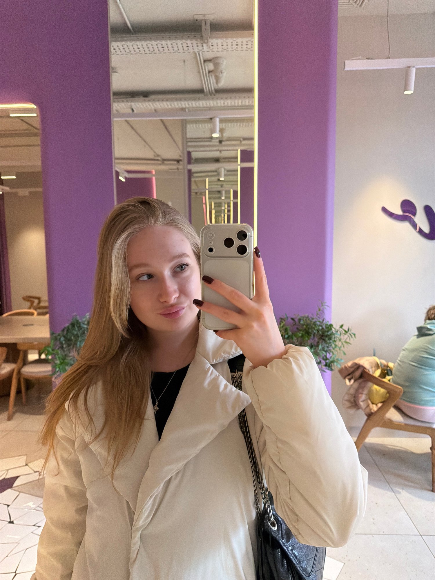 A young woman with long, blonde hair is taking a selfie in what appears to be an indoor public space, likely a store or shopping mall. She is holding a white iPhone with a visible triple-lens camera s…read more