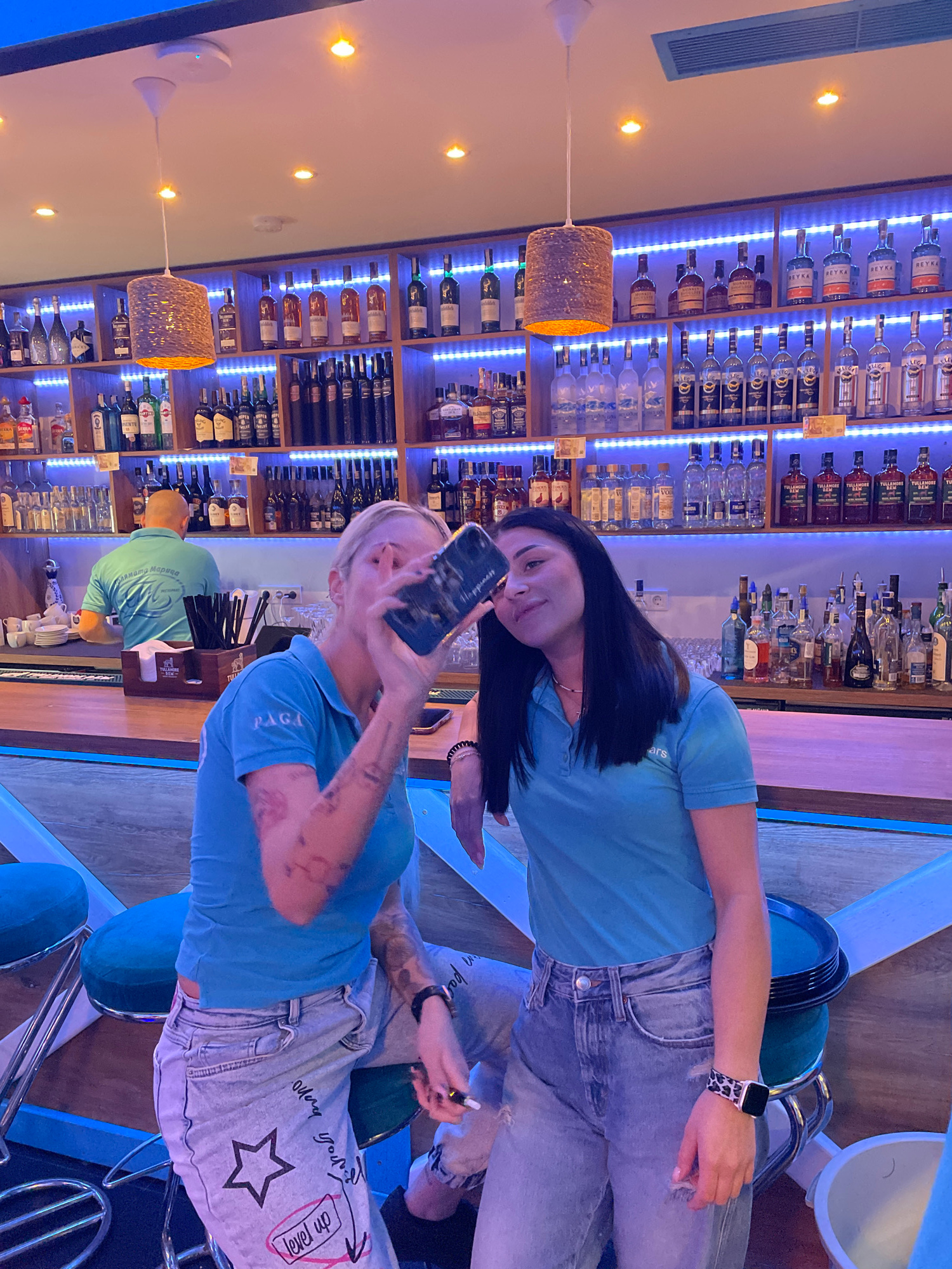 Two women are sitting at a bar. One woman with black hair is looking at the camera, while the other woman with blonde hair is holding a phone, presumably taking a picture. The bar has numerous shelves…read more
