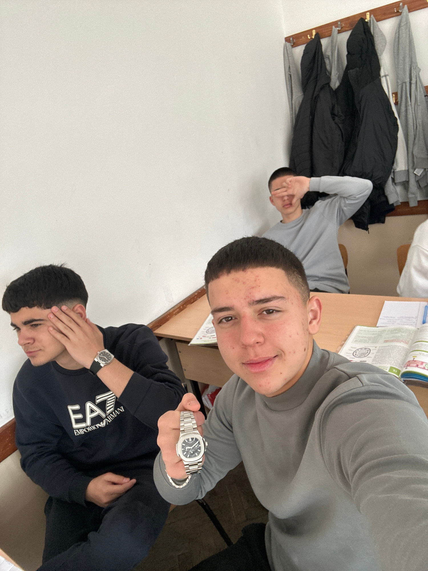 This image captures three young men indoors, likely in a casual setting such as a classroom or common room in Zlatograd, Bulgaria. The photo is taken from a tilted angle, focusing on the subjects. In…read more