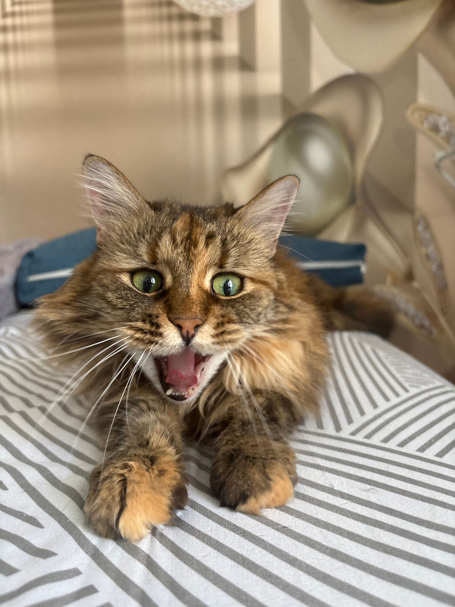 A tan and brown tabby cat with green eyes is lying on its back on a gray and white striped surface, possibly a pillow or blanket. The cat is opening its mouth wide, revealing its teeth and pink tongue…read more
