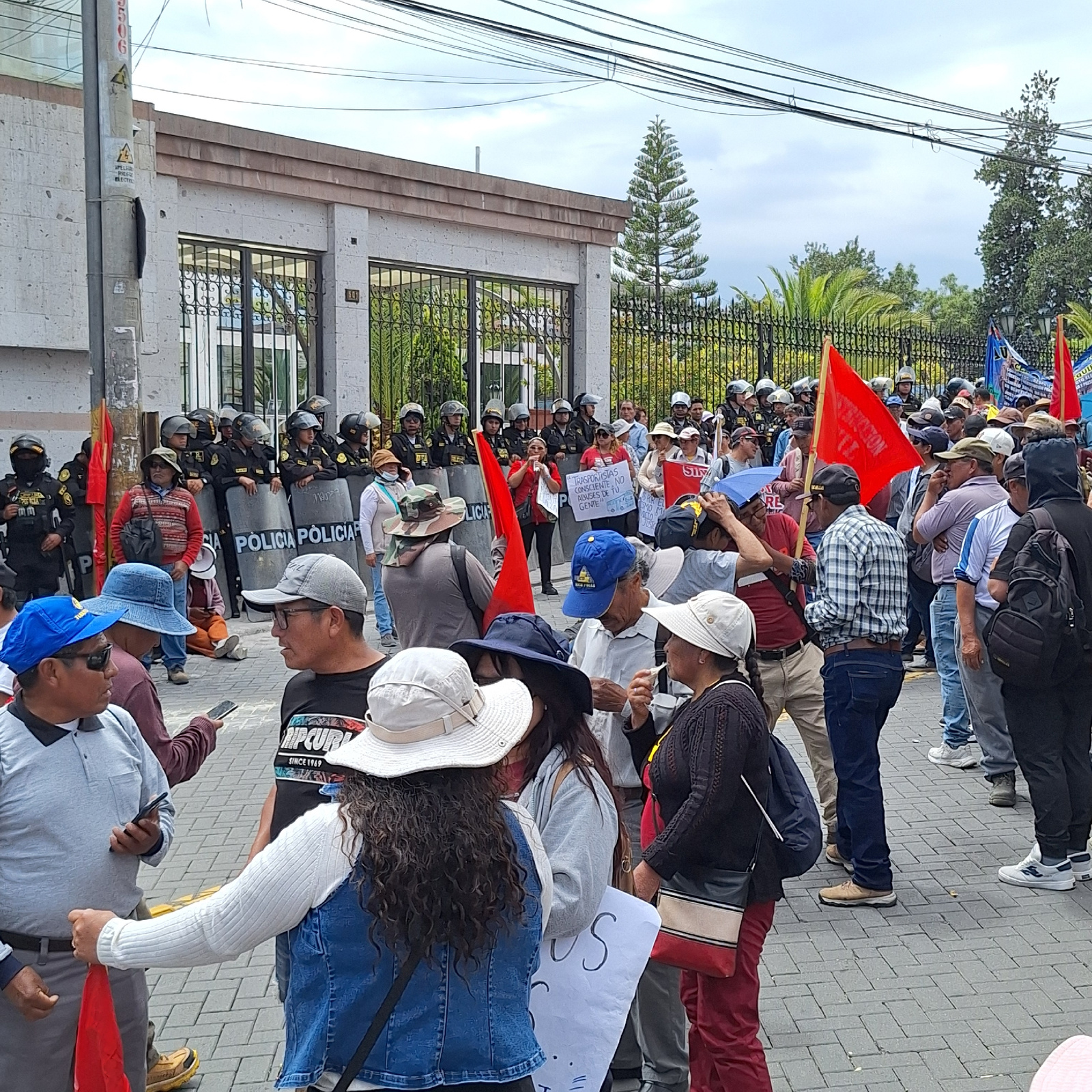 The image shows a protest in Miraflores, Peru. A line of police in riot gear stands behind shields labeled "POLICIA POLICIA" facing a crowd of protestors. Many protesters hold red flags; one flag bears the word "TRUCCION". A sign reads, "TRASPORTISTAS CONSCIENTE, NO ABUSES DE TU GENTE." Most protesters are wearing hats. Overhead, there are several power lines. A stone building with metal gates is behind the police line. The ground is paved with interlocking bricks. | Open Wire