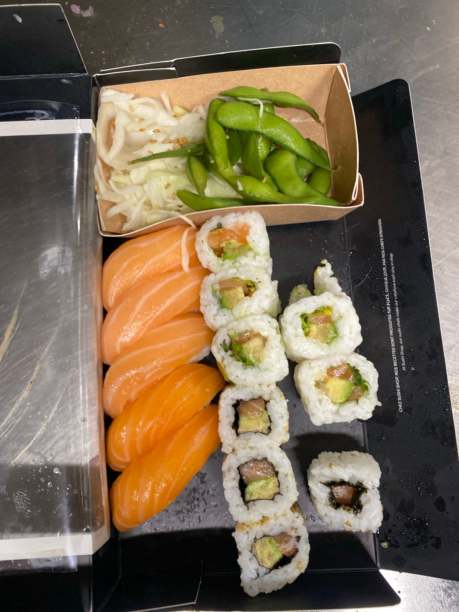 A high-angle, medium shot shows a black takeout container filled with various sushi items. Inside the container, from left to right, is a small cardboard box containing edamame and a shredded white vegetable; a row of salmon nigiri; two types of maki rolls. The text printed inside the box indicates that the image was taken at a Sushi Shop in Schiltigheim, France. The container is placed on a stainless steel surface. | Open Wire