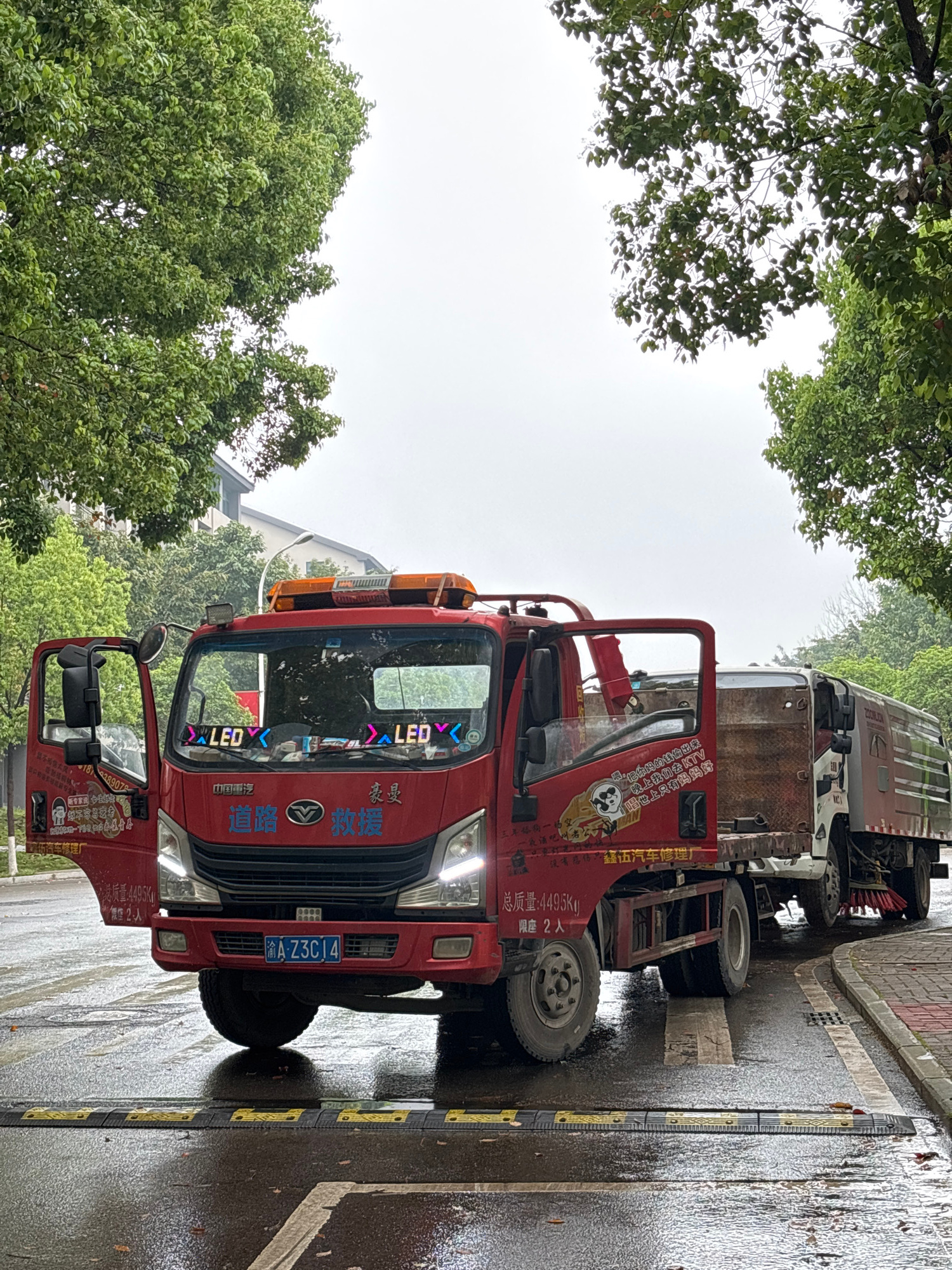 The image shows a red tow truck parked on a wet street, likely after a rain. The truck has Chinese characters and the license plate "渝A-Z3C14," suggesting it is located in Chongqing, specifically the…read more