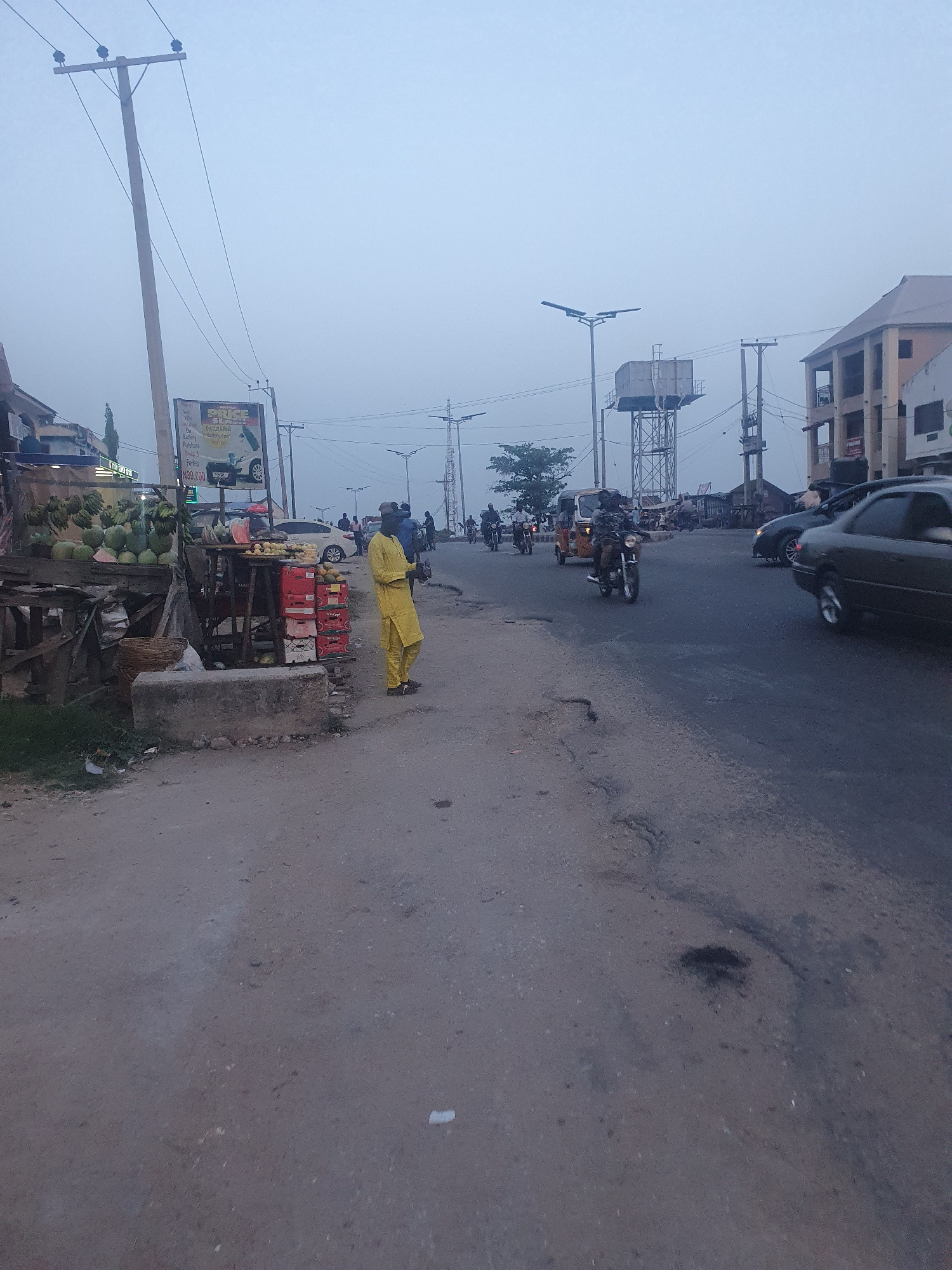 The image depicts a street scene in Lokoja, Nigeria, under overcast skies. A man in a yellow robe is walking on the shoulder of the road next to a roadside fruit stand. The stand has coconuts, bananas…read more