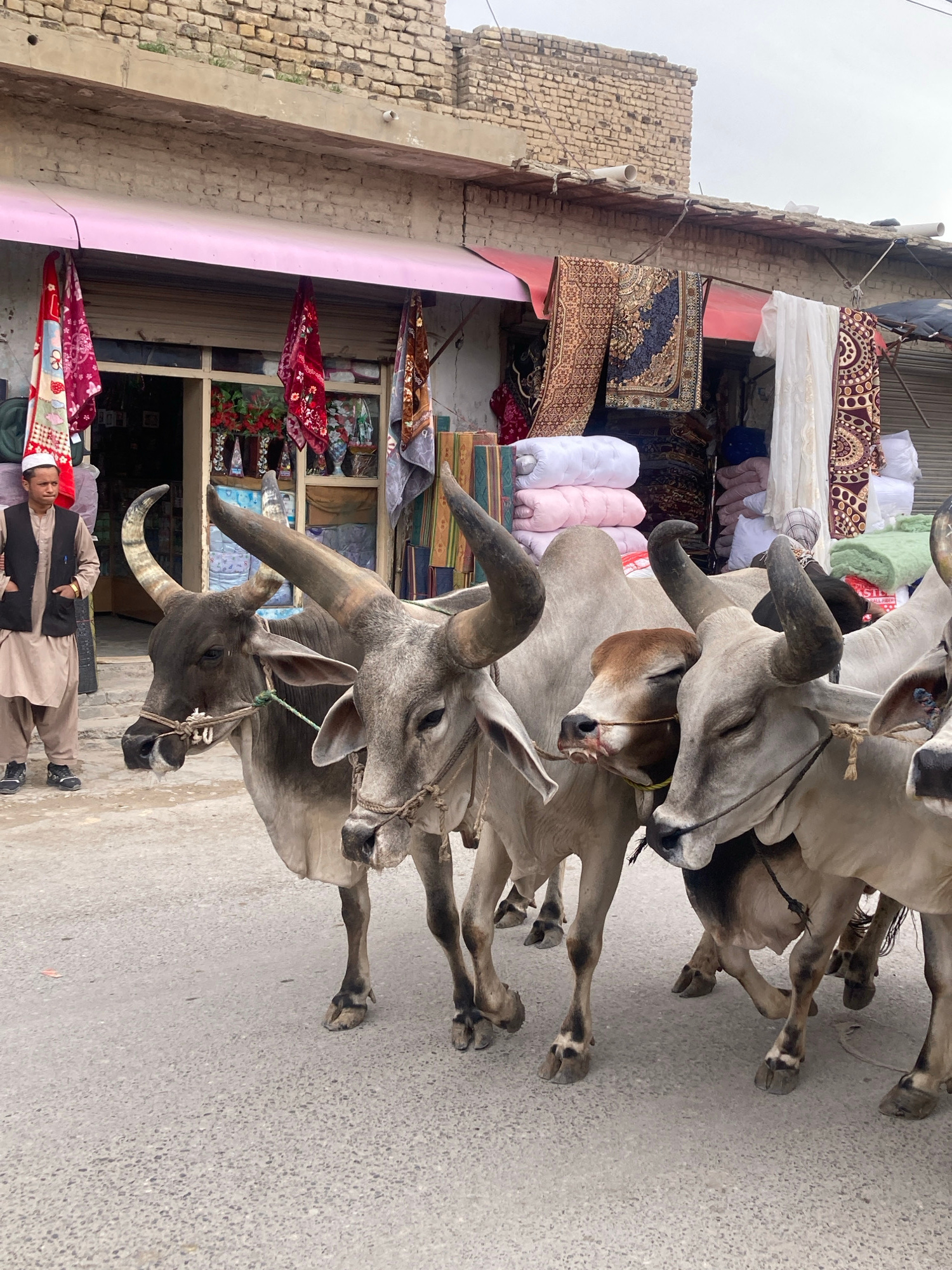 The image shows four gray oxen standing on a paved street in front of a building in Quetta City Tehsil, Pakistan. The oxen are tethered with ropes around their muzzles. A man stands in front of the ox…read more