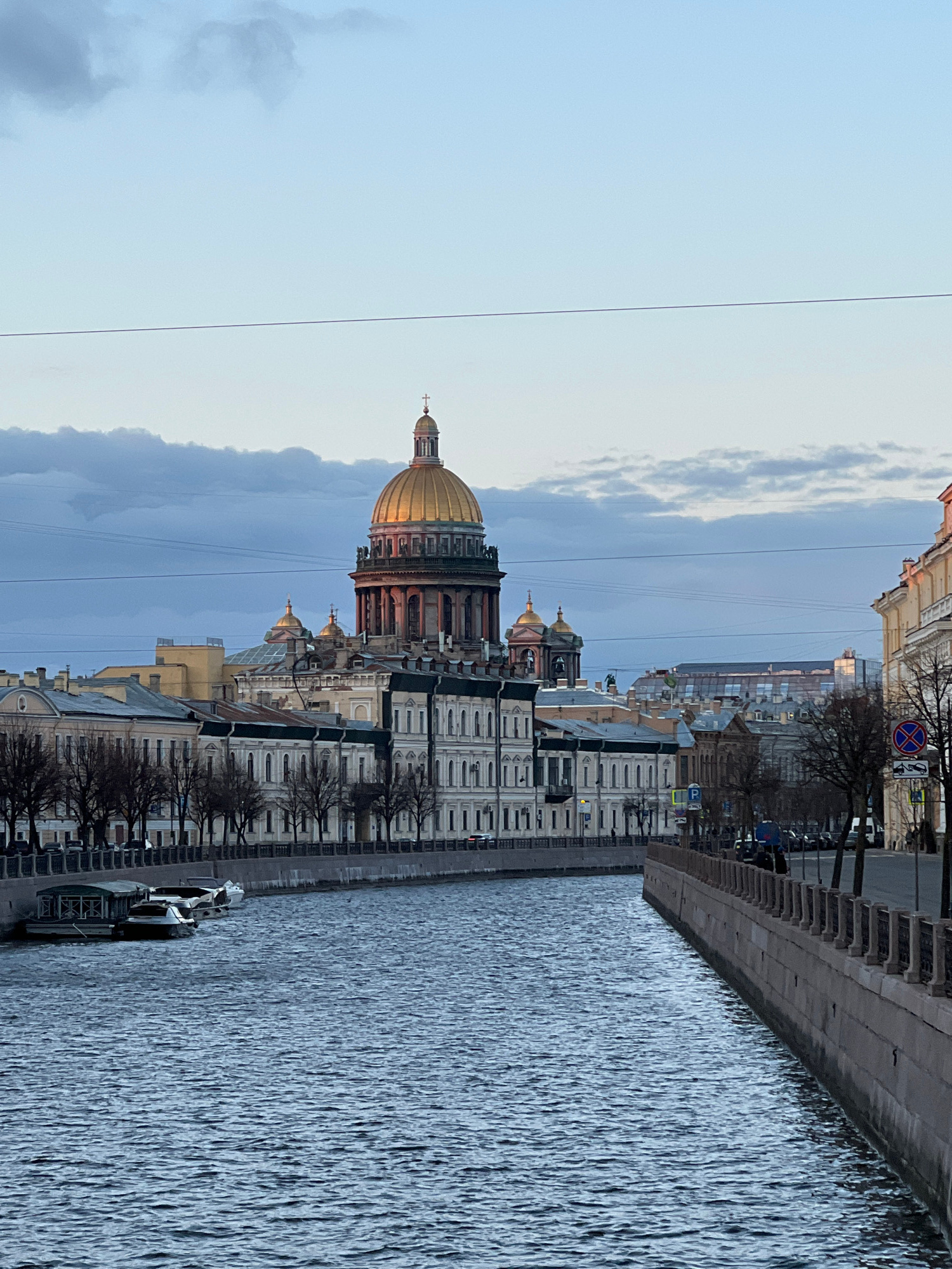 The image presents an urban landscape scene in Saint Petersburg, Russia, likely captured during late afternoon or on an overcast day. The view looks across a wide canal or river, with the city's archi…read more