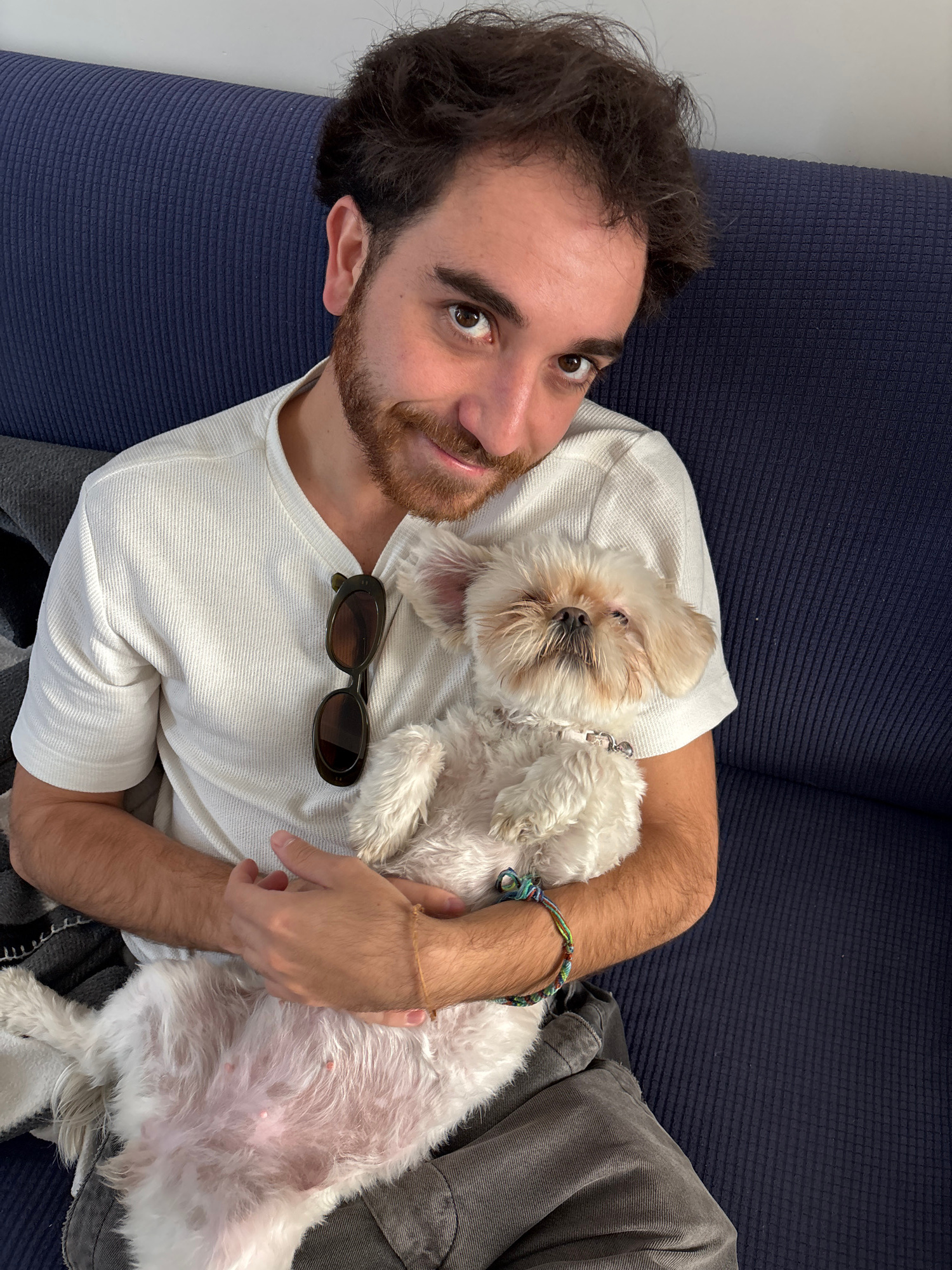A man is lying on a blue couch, holding a small white dog. The man has dark curly hair and a beard. He is wearing a white shirt. The dog is lying on its back in the man's arms. There is a pair of sung…read more