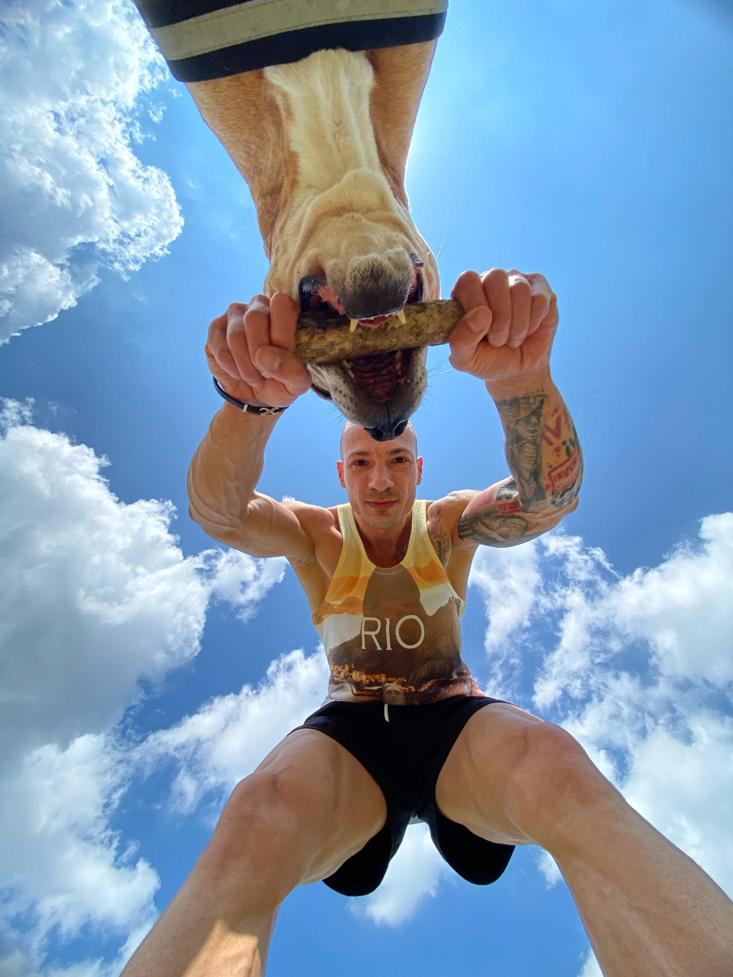 A low-angle, eye-level shot captures a man and his dog playing tug-of-war with a stick against a blue sky with scattered white clouds. The man, positioned at the upper right of the frame, is fair-skin…read more