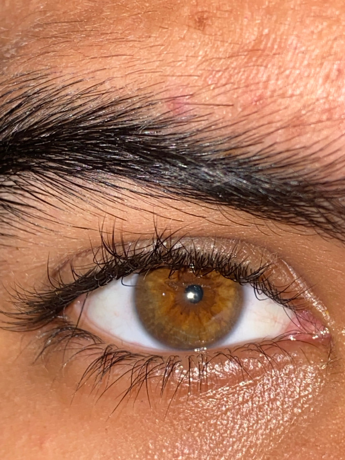 A close-up shot focuses on a right eye with a hazel iris and dark eyelashes. The eye is positioned to the right of the frame, reflecting a light source on its surface. To the left, a thick, dark eyebr…read more