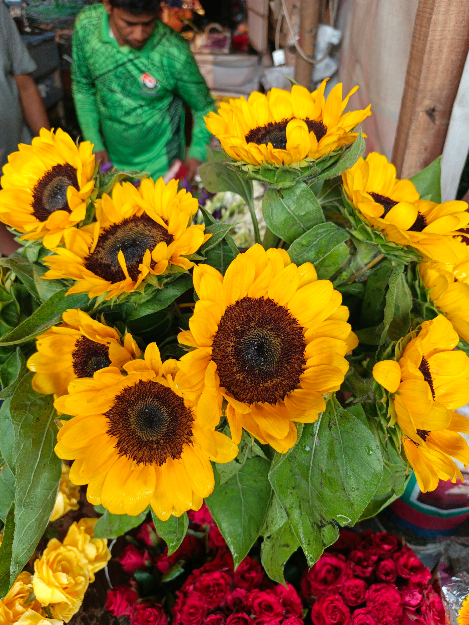 A high-angle, eye-level indoor shot depicts a bouquet of sunflowers, yellow and red roses, and a person. The sunflowers are in full bloom with vibrant yellow petals and dark brown centers, and some ha…read more
