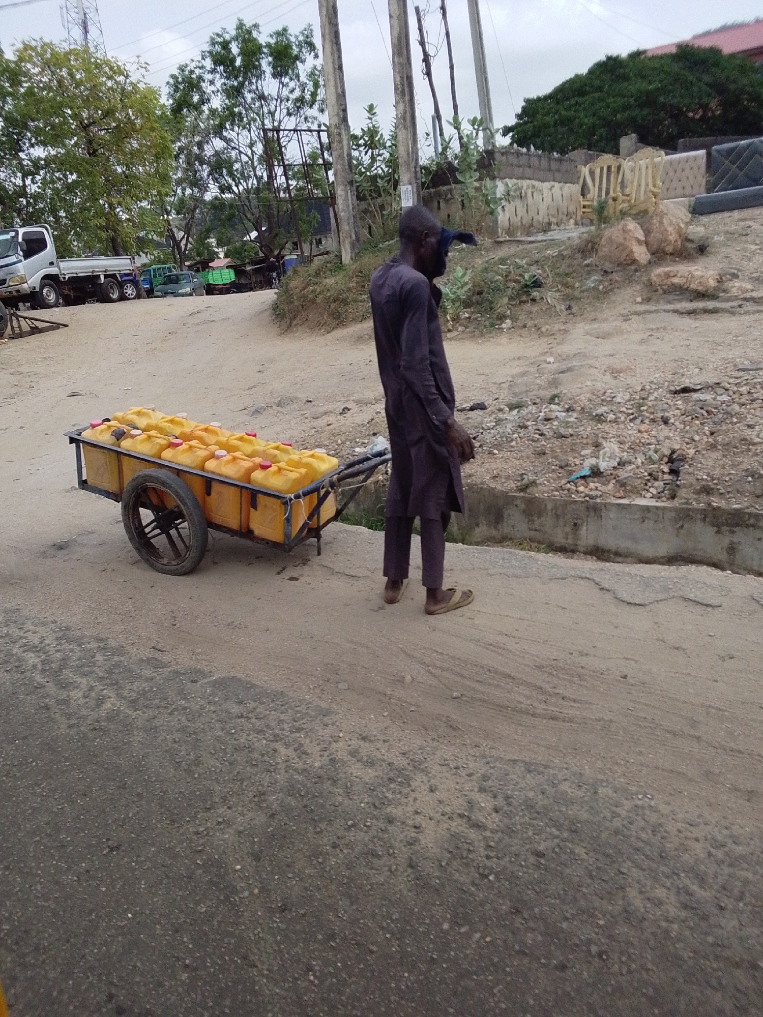 A man is pulling a cart full of yellow plastic containers. The containers are arranged in rows on the cart. The man is wearing a long-sleeved shirt and pants, with sandals on his feet. The cart has a…read more