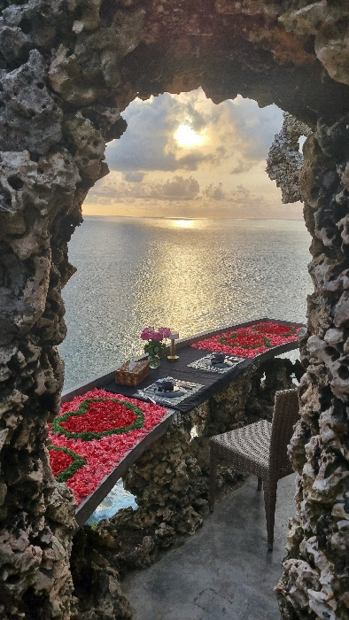This image, captured in Uluwatu, Indonesia, presents an unoccupied, romantically set dining area overlooking the ocean, framed by a natural rock archway. The primary view is through a rugged, light-gr…read more