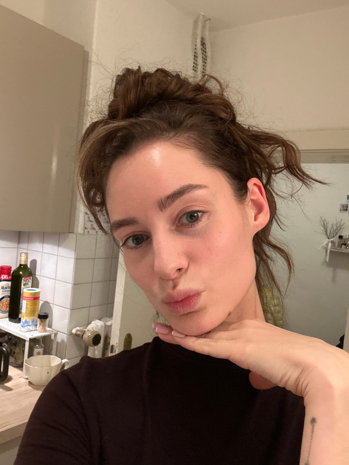 The image depicts a young adult female taking a selfie in a domestic kitchen environment within a residence in the city of Unknown, Unknown. The female, centered in the frame, has light skin, green ey…read more