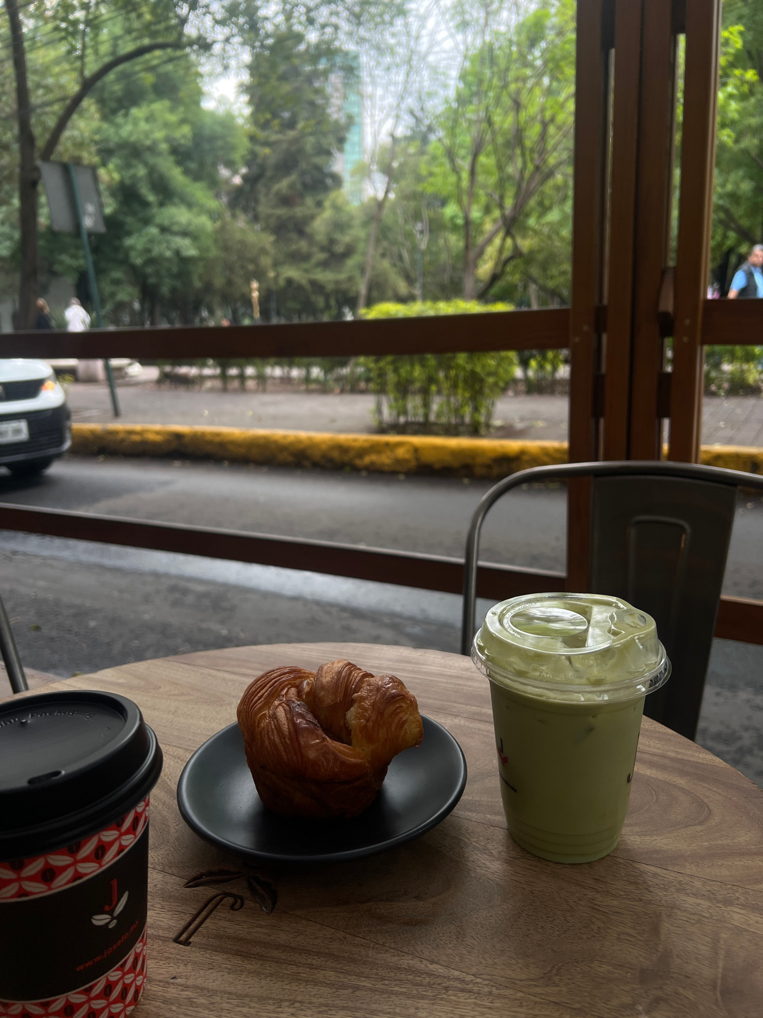 A bakery or cafe setting is presented in the image, possibly situated in Mexico City, Mexico. A brown wooden table, likely part of the cafe furniture, holds a selection of items. On the table, there's…read more