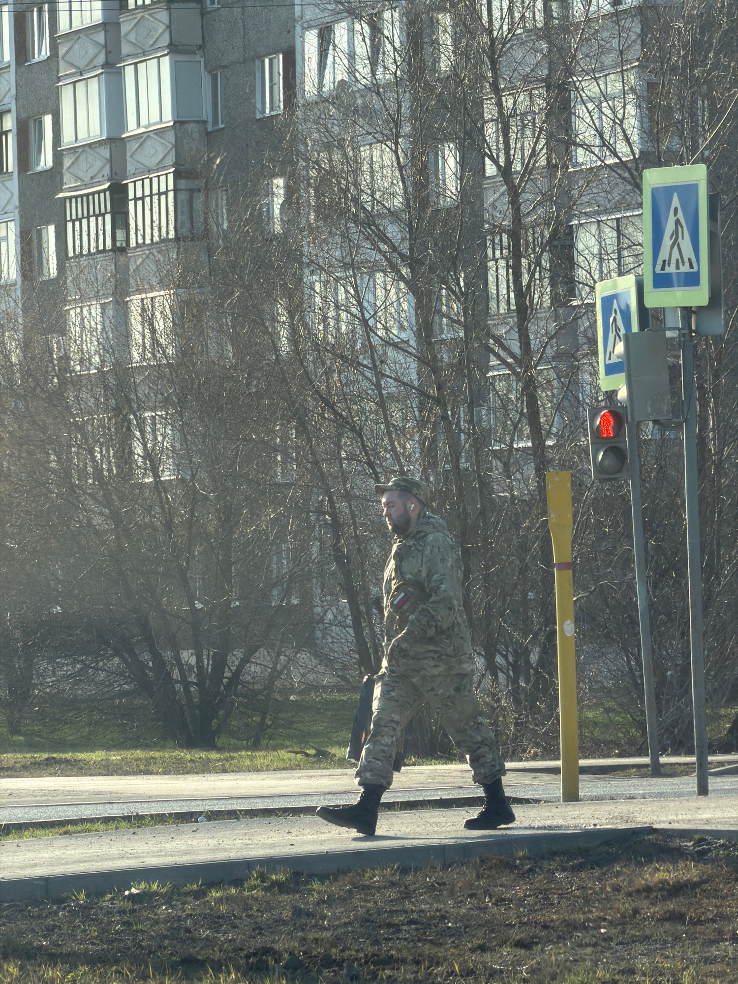 A person wearing camouflage clothing, a hat, and black boots is on the sidewalk next to a street. The person is near a pedestrian crossing sign and a traffic light showing a red light. Behind the pers…read more