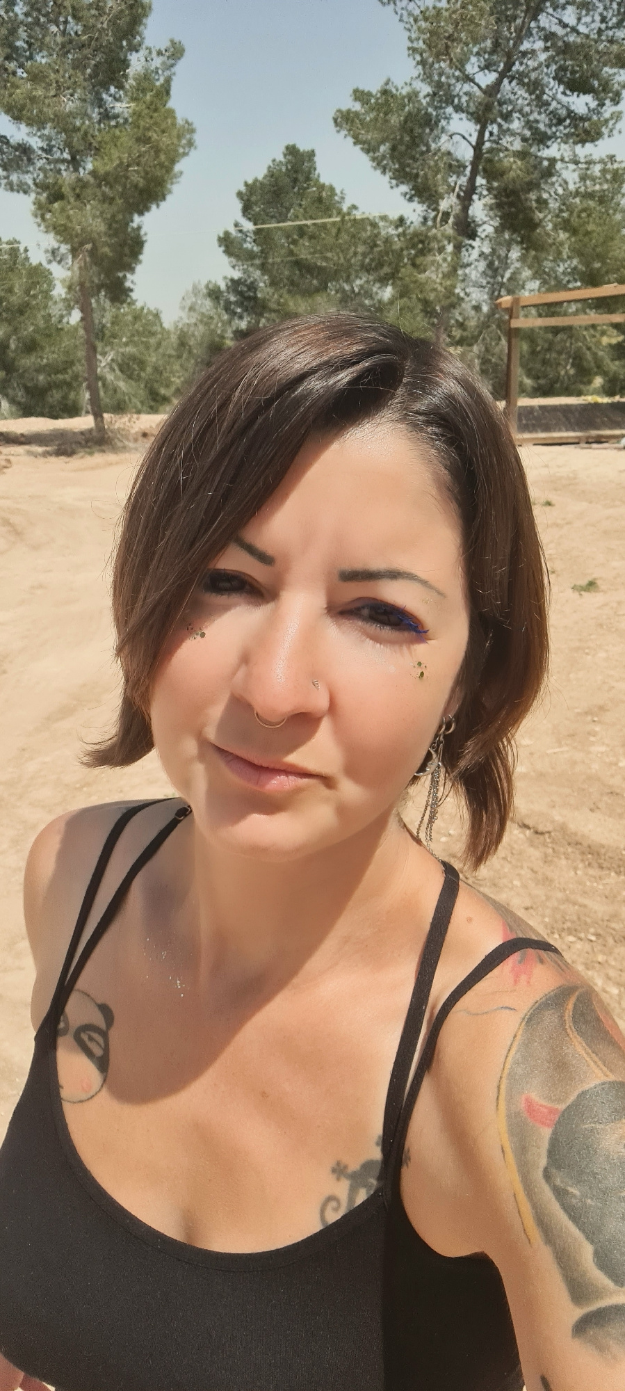 A woman is captured in a sunlit outdoor selfie, with her head tilted significantly to her right. She has short, dark brown hair and a calm expression, featuring a slight smirk. Her eyes are accentuate…read more
