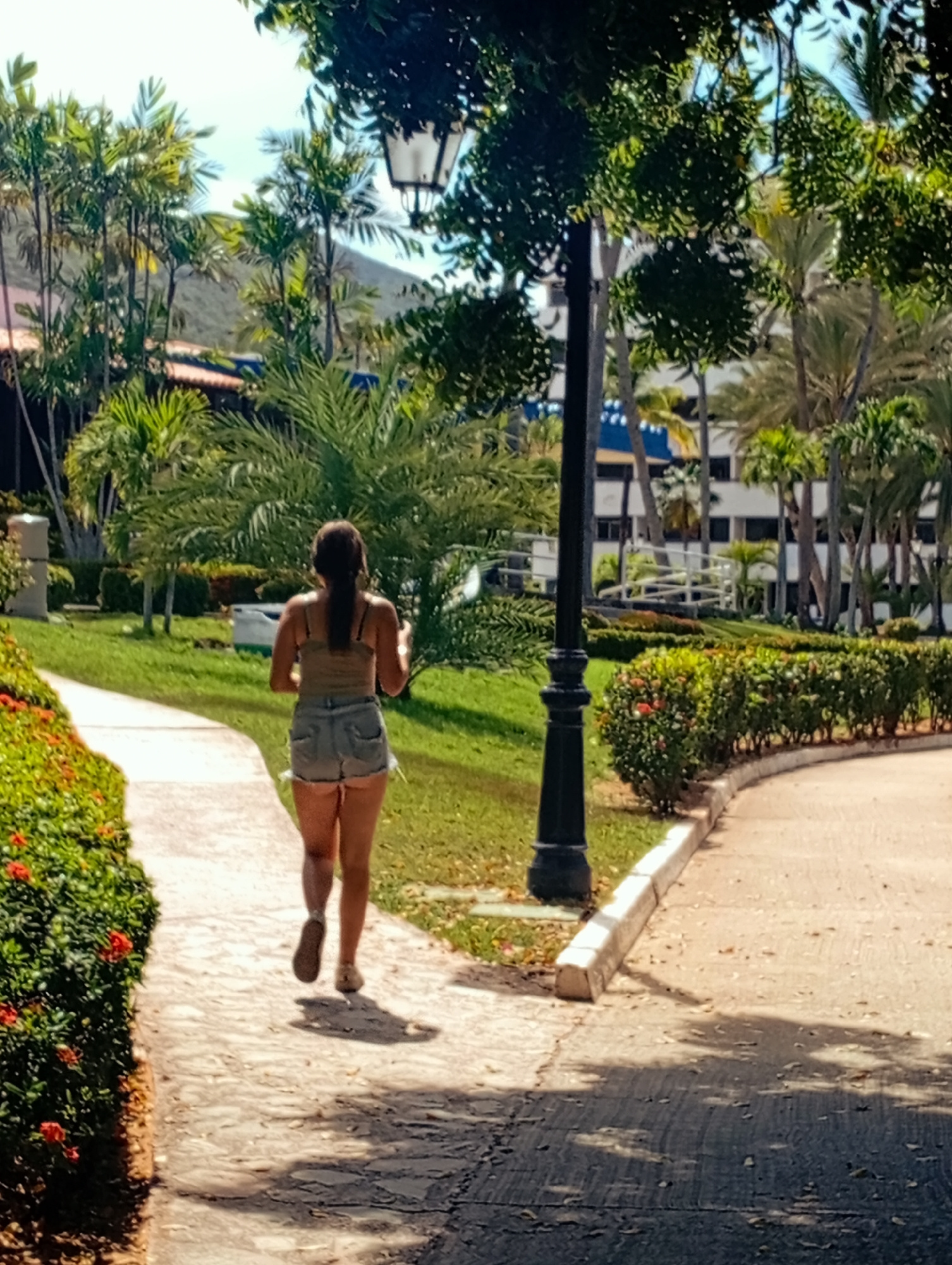 A woman walks away from the viewer on a paved path in a park-like setting in Playa El Agua, Venezuela. She is wearing denim shorts and a tank top. The path is lined with plants and flowers on one sideβ¦read more