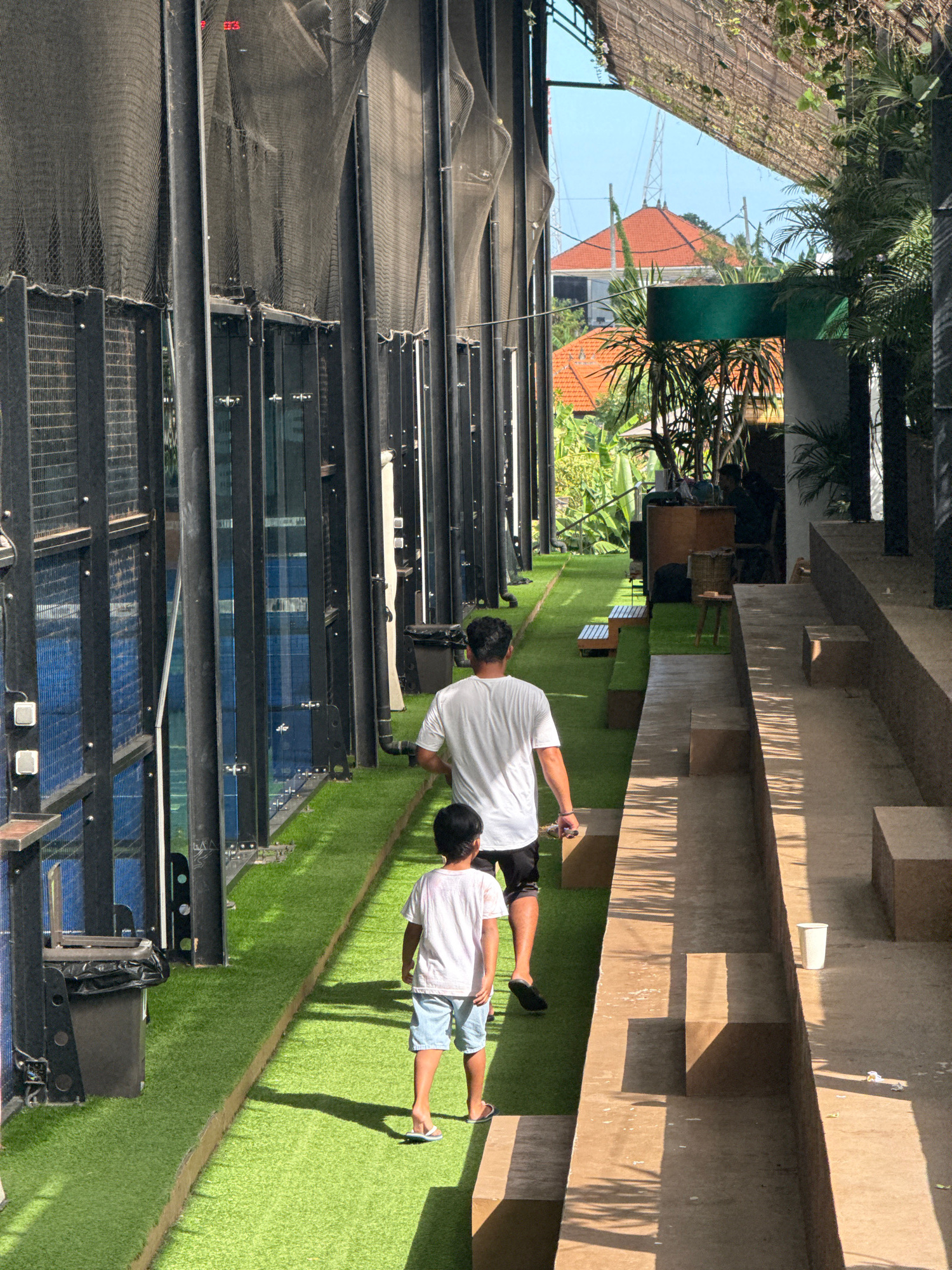 This is an outdoor scene in North Kuta, Indonesia, taken on a sunny day. Two people, an adult and a child, are standing on a bright green artificial turf lawn. The adult is wearing a white t-shirt and…read more