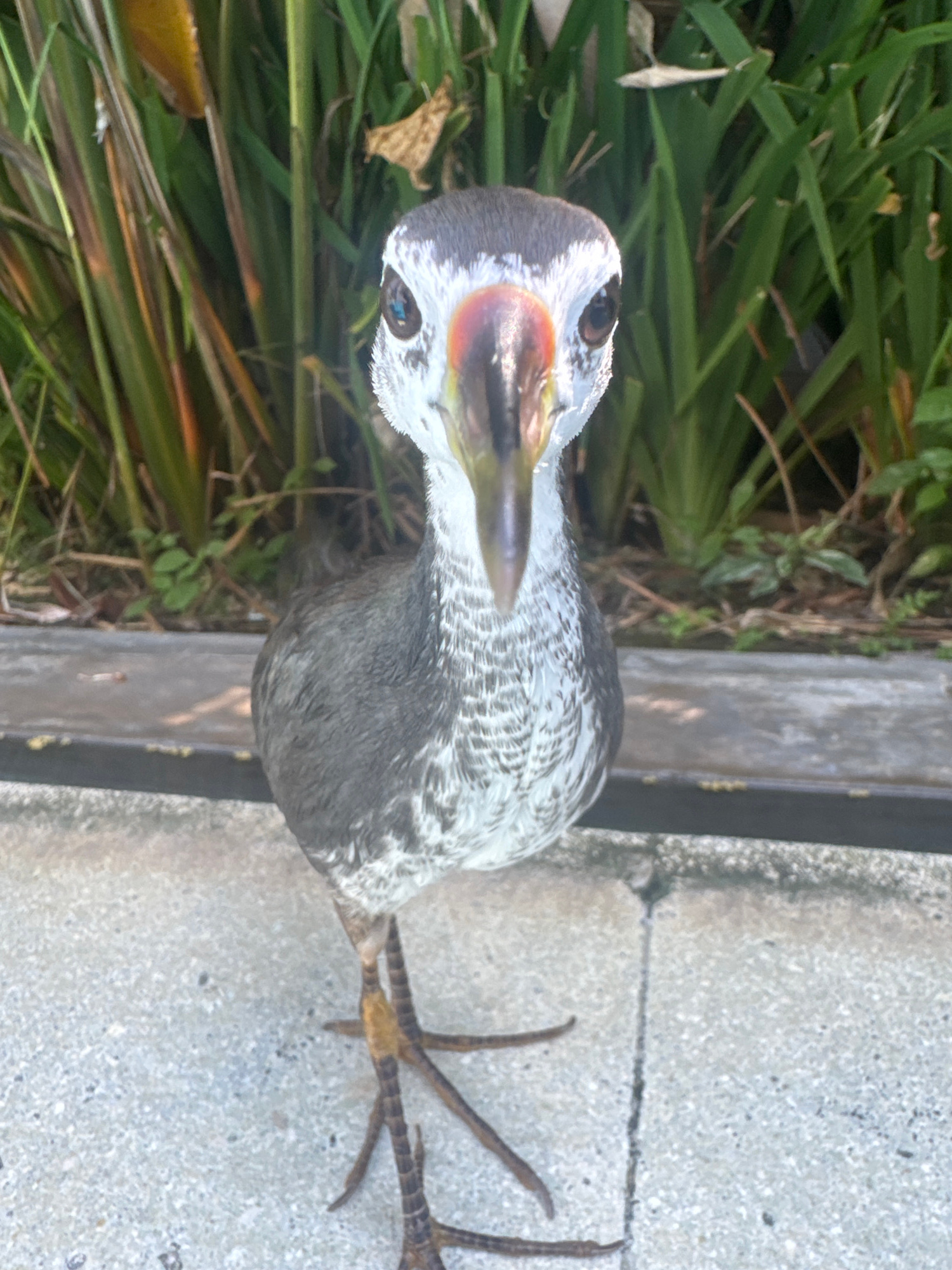 A grey waterhen stands near a concrete curb in an outdoor location in Kuta Selatan, Indonesia. The bird has a white forehead and reddish facial shield, with long toes on its brown legs. Vegetation isβ¦read more