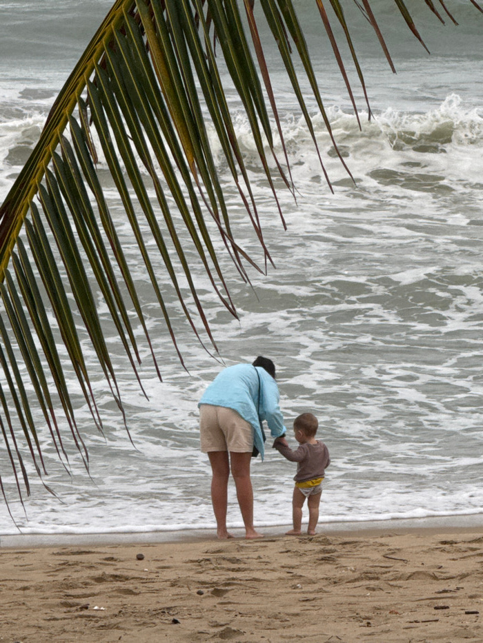 A beach scene in Nha Trang, Vietnam, features two individuals standing at the waterline, observed from behind. An adult, wearing a light blue long-sleeved top and light brown shorts, stands with their…read more