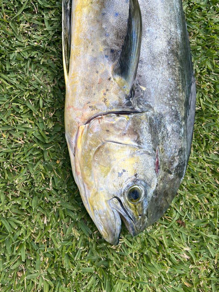 A close-up shows a mahi-mahi fish resting on green grass. The fish displays a mix of silver, gold, and bluish hues on its skin. Its eye is open and reflective, and its mouth is slightly ajar, revealin…read more